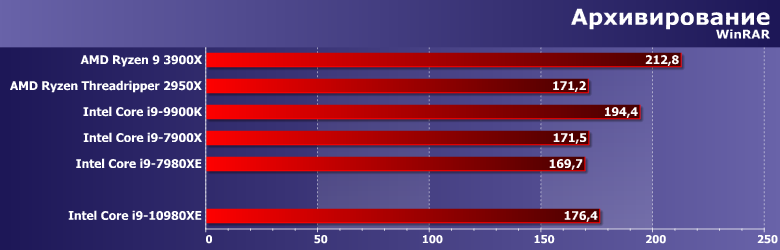 WinRar «недолюбливает» не только лишь Ryzen, но и mesh-сеть с «не инклюзивной» кэш-памятью. Впрочем, с Ryzen в последнее время ситуация как раз сильно улучшилась — виной чему огромный L3 линейки 3000. А Cascade Lake и Skylake-X остались одного поля ягодами: узким местом является сама по себе mesh-сеть, работающая во всех моделях семейства примерно одинаково.