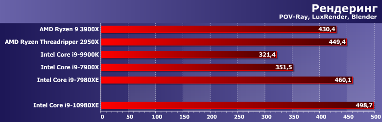 Цена наконец-то делает возможным непосредственное сравнение новинок с прошлогодними Ryzen Threadripper. Которые, напомним, «справлялись» ранее с Х-серией даже без учета ценовой форы (хотя на практике не учитывать двукратную разницу в цене невозможно). Теперь же этой разницы практически не осталось — а что с производительностью? Сравним ее со старшим в Х-линейке Threadripper 2950Х, который все-таки чуть дешевле, чем Core i9-10980XE, хотя и не принципиально.