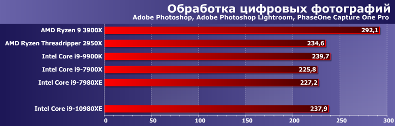 Зато в этой группе хорошо видно отсутствие принципиальных изменений: производительность подросла лишь пропорционально увеличению тактовой частоты. Но, опять же, благодаря резкому снижению цены при сравнении с Ryzen Threadripper все хорошо. А вот в буквальном смысле слова наступающий на пятки Ryzen 9 3900X пугает.