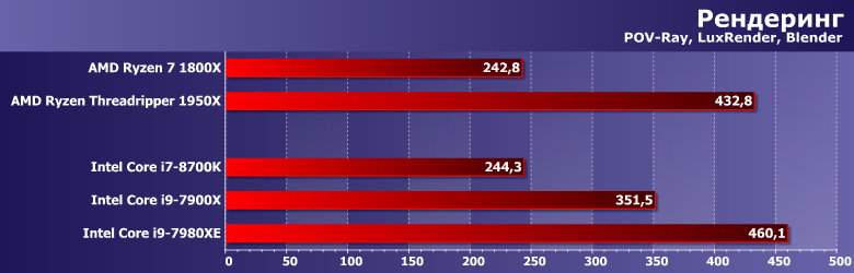 Программы нагружают работой все ядра, но всему есть предел — эффективность их использования выше определенной точки быстро снижается. Где-то до десяти ядер прирост можно считать близким к линейному, но не далее — хотя бы из-за того, что результирующая частота работы будет более низкой. При этом даже преимущество в количестве ядер не позволяет i9-7980XE оказаться лидером.