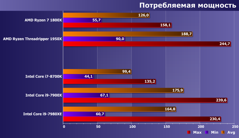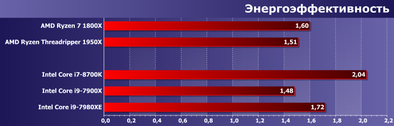 Однако стоит отметить, что в таких условиях Core i9-7980XE оказывается более экономичным, нежели i9-7900X. Это не какое-то ограничение системы питания плат и/или охлаждения — в этом случае результат был бы одинаковым. Так что просто частоты в разных режимах загрузки подобраны достаточно грамотно для того, чтобы новый экстремал мог не только работать быстрее (что ему как мы видели, как раз не всегда удается), но и потреблять меньше энергии.