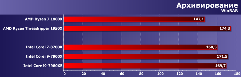 Как уже было сказано выше, подходы AMD и Intel к HEDT-системам различаются — и каждый имеет свои плюсы и минусы. Это касается даже такой бытовой задачи, как сжатие данных. Ryzen Threadripper — это два Ryzen, каждый из которых снабжен своим двухканальным контроллером памяти, причем частоты работы от такой операции практически не пострадали. В итоге какой-никакой прирост производительности получился — пусть и скромный. Да и разница между 1950X и 1920Х тоже была за счет разного количества ядер, но примерно на одной частоте — пусть и еще более скромная.