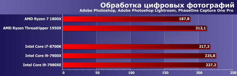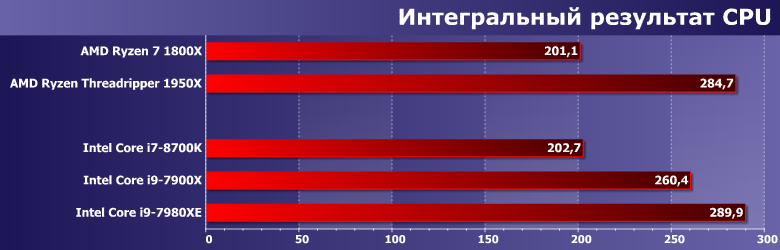 Конечный итог выглядит достаточно забавным — фактически «осенними продуктами» Intel отыграла прорыв AMD в области повышения производительности процессоров. Во всяком случае, с точностью до миллилитра топовые процессоры для LGA1151 и LGA2066 работают чуть быстрее, чем для АМ4 и TR4 соответственно. Правда с практической точки зрения какой-то смысл в этом есть лишь применительно к первой платформе, поскольку в ее случае и с ценами все нормально, и другие преимущества есть. Вот у Skylake-X паритет в производительности наблюдается только при разной цене решений и наоборот :) Но объясняется это просто — на самом деле, не так уж и много в нашей тестовой методике задач что для Ryzen Threadripper, что для Core i9. Даже несмотря на то, что, по просьбам трудящихся мы сильно обогатили ее многопоточным ПО, вырезая (буквально по живому) разнообразный интерактив.