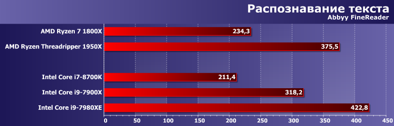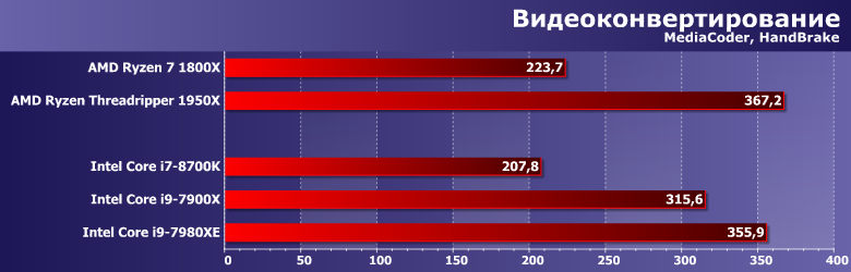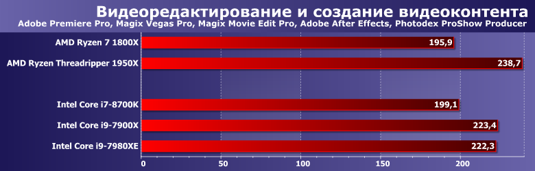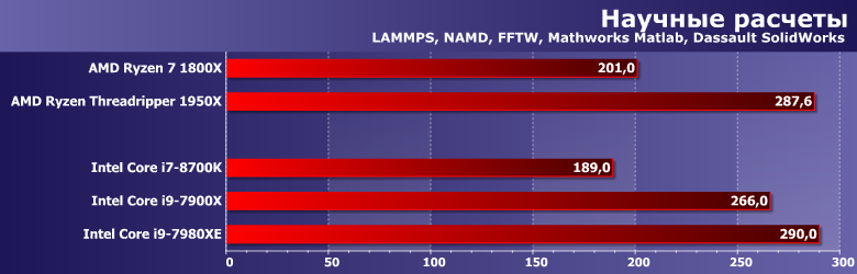 А вот в этих приложениях — позволяет, причем и преимущество в скорости можно уже считать заметным. Понятно, что в цене оно намного более весомо, но оценивать процессоры с этой точки зрения вообще не слишком оправдано — модели для массовых платформ мгновенно победят. Причем даже не факт, что это будут именно Ryzen 7 / Core i7 :) А Threadripper или Core i9 вообще нужны лишь тогда, когда в приоритете именно максимальная производительность одиночного процессора. Что, прямо скажем, бывает не так уж и часто.