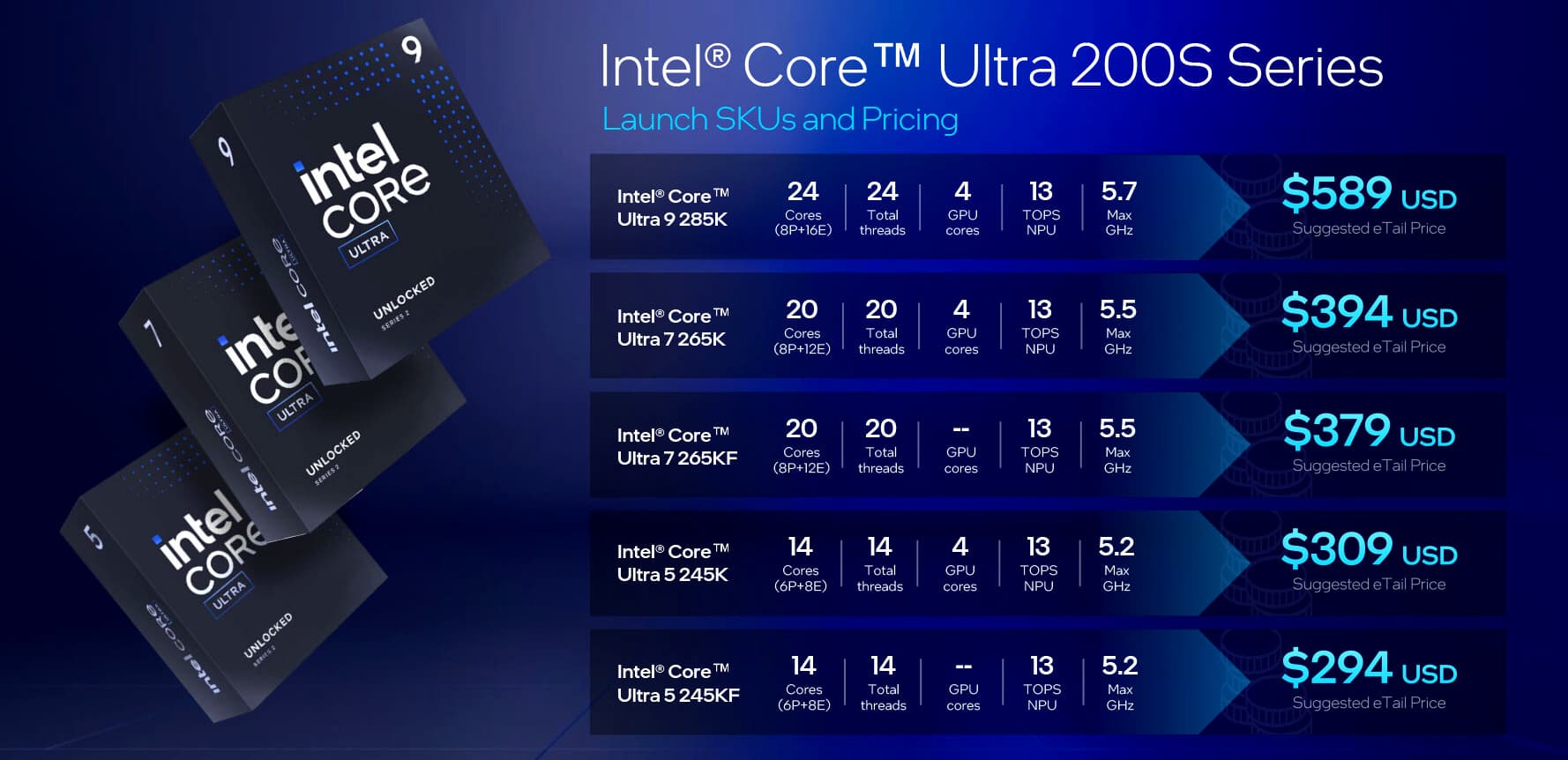 Кроме официального слайда, для удобства читателей мы свели в таблицу основные характеристики объявленных первыми моделей (официальных российских цен не существует, так что приводим североамериканские). Пока что не рассматриваем характеристики анонсированных позднее (на CES 2025 и далее) процессоров серии мощностью 65 Вт и 35 Вт — они также имеют схожее количество ядер, но должны предоставить еще лучшее сочетание производительности и энергоэффективности, и будут интересны в основном тем, кому нужны очень компактные, холодные и тихие системы. А вот особенно высокой производительностью они не отличаются по понятным причинам. Для удобства сравним основные K-модели с аналогичными процессорами Core 14-го поколения.