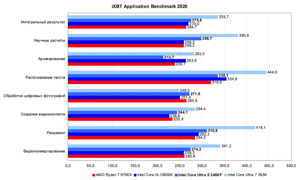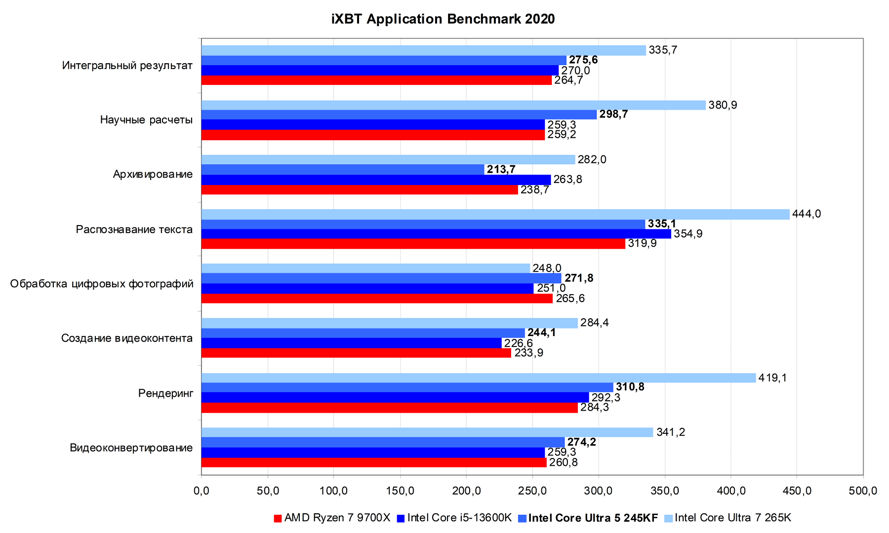 Также добавили к процессорам Intel еще и пару процессоров AMD, которые близки к рассматриваемому решению по цене и позиционированию. К сожалению, результатов шестиядерного Ryzen 5 9600X у нас нет, поэтому придется обойтись восьмиядерными моделями Ryzen 7 9700X (в двух вариантах — с ограничением TDP по умолчанию на 65 Вт, и в расширенном до 105 Вт), который близок к 245KF по цене, а также специализированным игровым Ryzen 7 9800X3D в качестве эталона для соответствующих развлекательных приложений. Хотя последний вообще не является прямым конкурентом рассматриваемого процессора Intel, они совсем разные.