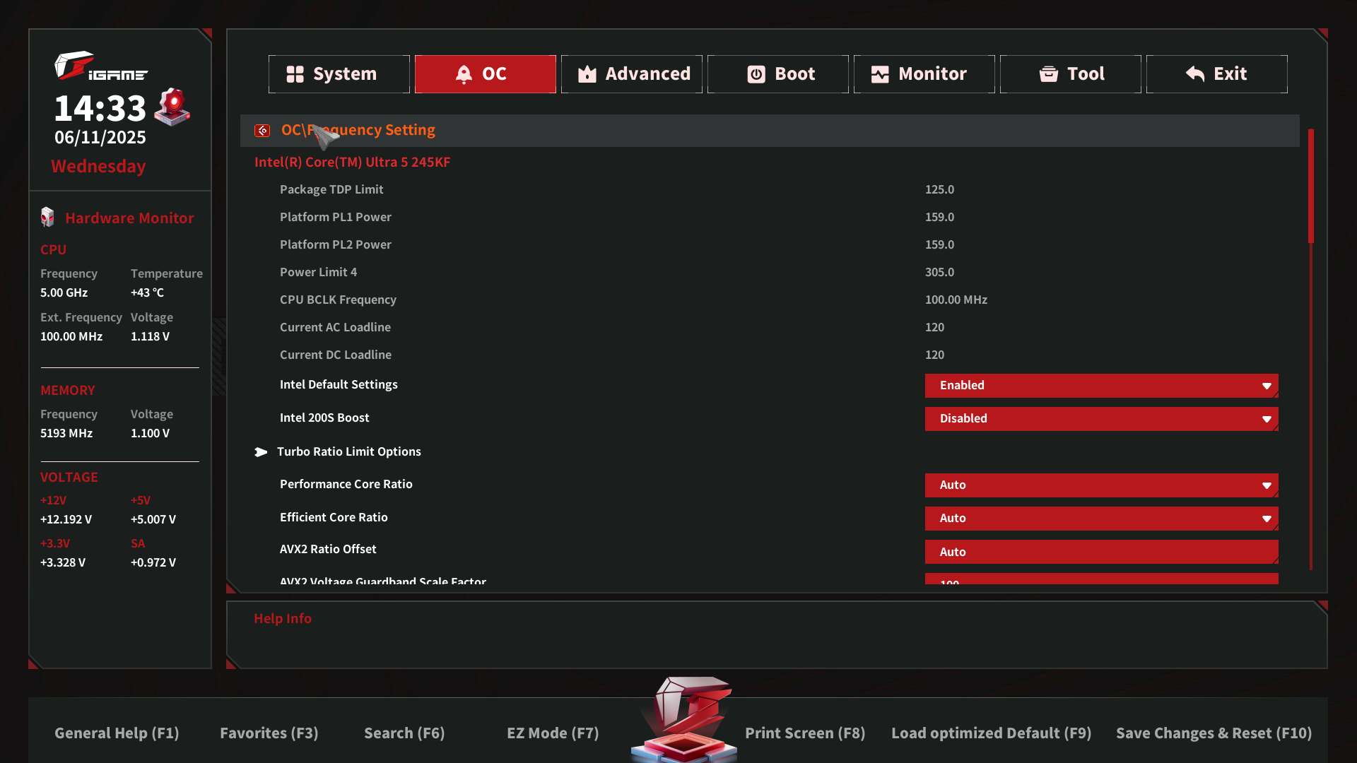 О разгоне процессоров серии Core Ultra 200S в случае моделей для энтузиастов, на что указывает буква K в наименовании, мы уже говорили — это сделать легко, так как они имеют разблокированный множитель и позволяют изменять множество тонких настроек в BIOS: напряжение и частоты для P- и E-ядер отдельно, есть и возможности установки тактовой частоты для межкристальных соединений и пр. И если в предыдущих семействах главным тормозом для разгона было сверхвысокое потребление энергии и высокие температуры, теперь процессоры потребляют энергии меньше и греются не так сильно. Кроме этого, Intel даже увеличили максимальную температуру тротлинга до 105 °C, и этот предел еще можно увеличить в настройках BIOS до 115 °C, хотя для младшего 245KF это вряд ли будет востребовано.