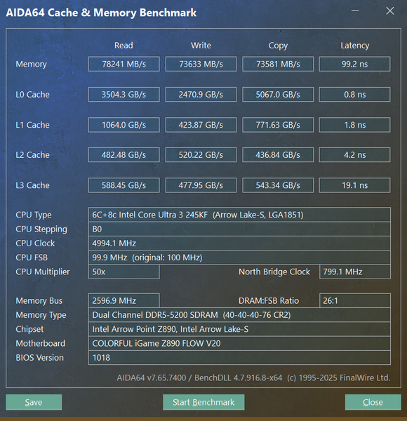 Мы не думаем, что между Core Ultra 9 285K, Core Ultra 7 265K и Core Ultra 5 245KF будет наблюдаться большая разница, но на всякий случай решили это проверить. Тем более что в случае уже третьей модели мы использовали в очередной раз обновленную прошивку с частично исправленными проблемами Arrow Lake. Для проверки мы используем тесты памяти и кэша из пакета AIDA64, который измеряет пропускную способность и задержки всех компонент подсистемы памяти. В этом тесте для всех процессоров используются равные условия — режим DDR5-5200.