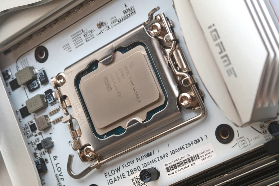 Процессор Core Ultra 5 245KF поставляется в более простой картонной коробке, по сравнению с флагманской моделью Core Ultra 9 285K, хотя основы дизайна и размеры коробки одинаковы для всех вышедших процессоров Core Ultra. В коробке также нет комплектной системы охлаждения. Сами новые процессоры внешне очень похожи на процессоры предыдущих серий, но, при одинаковых габаритах, расположение пазов для установки у них другое, а дополнительные контакты используют пространство посередине. Распределительная крышка у Core Ultra 200S чуть длиннее и уже, чем у семейства Raptor Lake, расположение SMD-резисторов и контактные площадки на лицевой стороне изменились. Но важнее всего то, что сохранена совместимость с кулерами, разработанными для LGA1700, это значительно облегчает задачу охлаждения новых процессоров.