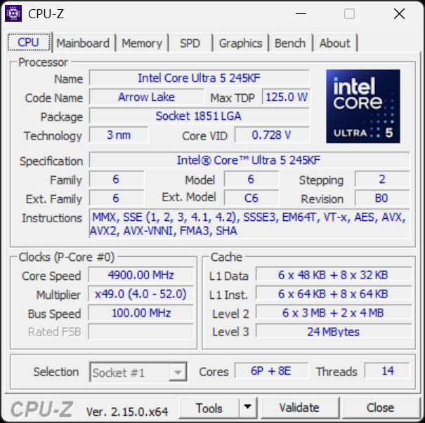 В описании рассматриваемой сегодня модели процессора осталось показать скриншот с данными утилиты CPU-Z, которая поддерживает новое семейство и подтверждает приведенные выше характеристики модели Core Ultra 5 245KF.