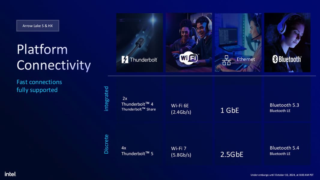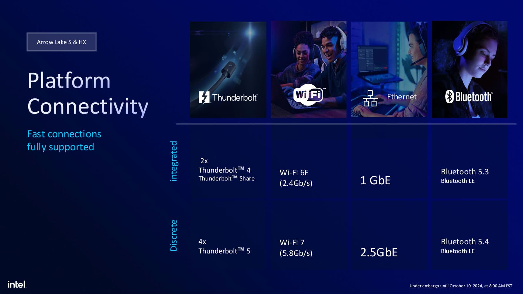 На шоу CES 2024 компания заявила, что процессоры серии Arrow Lake будут выпущены для настольных компьютеров во второй половине 2024 года, и они будут «первыми игровыми процессорами с ускорителем ИИ», хотя там же были представлены настольные AMD Ryzen 8000G, также имеющие специализированный блок XDNA AI. В мае Intel подтвердила, что Arrow Lake выпустят в четвертом квартале 2024 года, а во время Computex они поделились некоторыми подробностями об изменениях новых ядер Lion Cove и Skymont, общих для Arrow Lake и мобильных решений Lunar Lake. 10 октября компания анонсировала настольные процессоры Arrow Lake-S и указала точную дату выхода — 24 октября, тогда они и вышли на рынок, хоть и не совсем в том виде, который изначально предполагался.