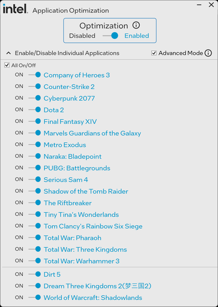 Есть еще один момент, который нужно рассмотреть. В своих игровых тестах компания Intel нередко упоминает специальное ПО для оптимизации игровой производительности — APO (Application Optimization). Технология поддерживается лишь в паре десятков игр, и в основном довольно старых, мы используем для своих тестов лишь пару-тройку из них. И для того, чтобы всё проверить, мы провели небольшое тестирование с включенным APO в этих играх.