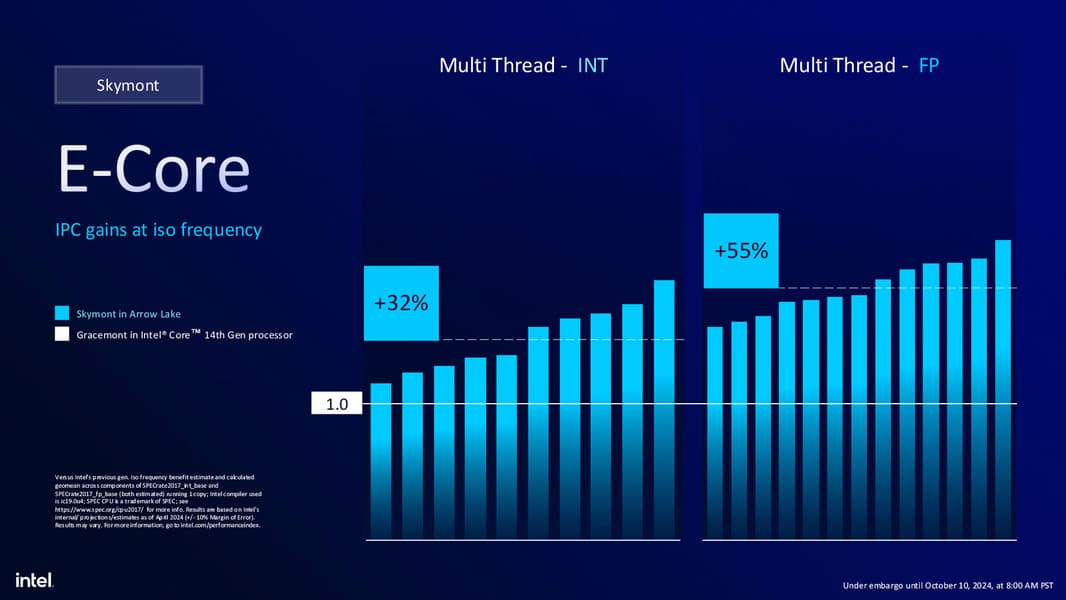 В Arrow Lake же все четыре кластера E-ядер Skymont входят в плитку Compute с P-ядрами и делят кольцевую шину и L3-кэш с высокопроизводительными ядрами. Что касается прироста производительности, то компания Intel заявила увеличение показателя IPC для Skymont по сравнению с показателями Gracemont процессоров Raptor Lake-S в 32%, что можно считать весьма впечатляющей прибавкой производительности для перехода с одного поколения CPU на другое.