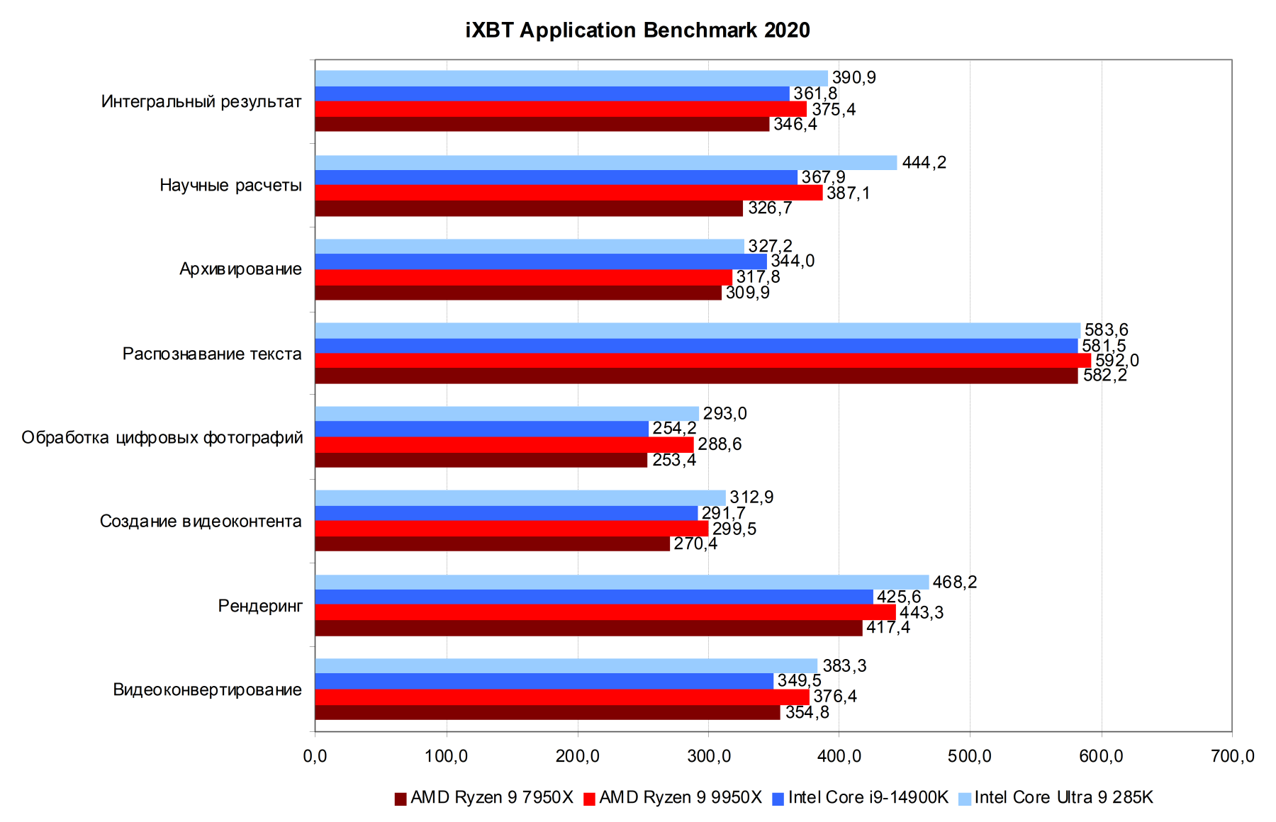 Почему так получилось — вопрос интересный и требующий отдельного исследования, ведь в другом ПО такого стабильного отставания от соперников мы не наблюдали. Вероятнее всего, сказалось именно влияние слишком больших задержек доступа к памяти и слегка ухудшенные параметры кэша по сравнению с монокристальным поколением Raptor Lake, да и Ryzen по задержкам доступа к памяти явно лучше нового Core Ultra 9. Других объяснений у нас на сегодня просто нет. Хотя подождем обещанных Intel декабрьских обновлений прошивки — вдруг они всё исправят?
