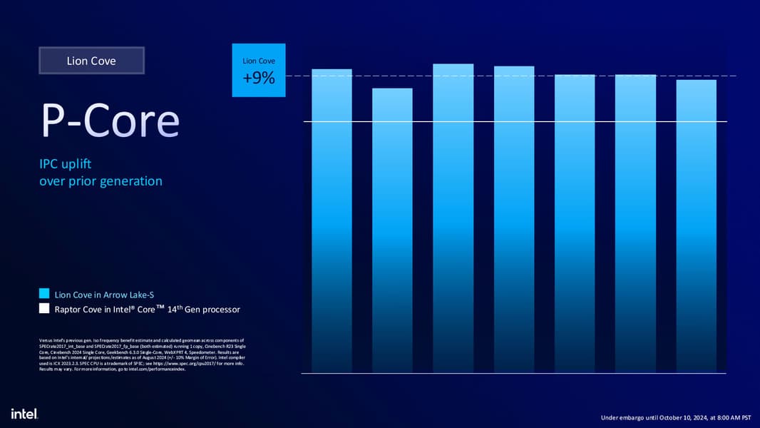 Такие же P-ядра используются и в мобильных процессорах Lunar Lake, есть лишь отличия в системе кэширования данных: собственный L2-кэш каждого P-ядра в Arrow Lake увеличен до 3 МБ против 2,5 МБ для ядер Lunar Lake. А восемь P-ядер вместе с кластерами E-ядер используют общий L3-кэш в 36 МБ, что тоже больше, чем 12 МБ в Lunar Lake. Если говорить об ожидаемом повышении производительности, то для Lion Cove компания Intel заявила прирост в производительности на такт порядка 9% относительно Raptor Cove из Raptor Lake-S.