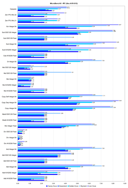 Движок внеочередного выполнения команд изменился больше всего: очередь распределения расширена с шести до восьми позиций, очередь отбрасывания команд увеличена вдвое — с 8 до 16. Внедрен независимый доступ к очереди, который помогает снизить задержки, окно внеочередных команд расширено с 256 до 416 записей, увеличены физические размеры регистровых файлов, глубина резервирования и буфера загрузки и сохранения. К целочисленному исполнительному движку подключено 26 портов отправки, он имеет восемь целочисленных ALU с тремя портами адресного перехода и тремя загрузками на цикл — вместо двух в предыдущем поколении ядер. Векторный движок содержит четыре 128-разрядных блока FPU, снижены задержки в блоках FMUL, FADD и FMA, а округление чисел с плавающей запятой использует аппаратное ускорение. Производительность блока загрузки и сохранения адресов увеличена, размер буфера TLB вырос с 3096 до 4192 записей.
