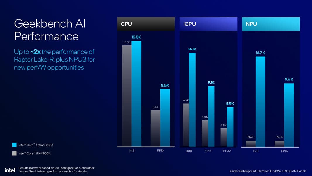 Серия процессоров Core Ultra 200S — первые настольные процессоры Intel с выделенным нейропроцессором NPU. Плитка SoC содержит нейропроцессор NPU 3, который известен по мобильным решениям семейства Meteor Lake (Core Ultra 100) — в отличие от NPU уже 4-го поколения в мобильных же Lunar Lake (Core Ultra 200V). Нейропроцессор содержит два движка Neural Compute Engine (NCE) с двумя массивами умножителей INT8/FP16, четырьмя DSP SHAVE и 4 МБ памяти SRAM. В вычислениях с применением искусственного интеллекта этот блок обеспечивает пиковую производительность в 13 TOPS, что явно ниже системных требований локального ускорения Microsoft Copilot+, которые составляют 40 TOPS, но Windows 11 вполне может использовать его в других приложениях.
