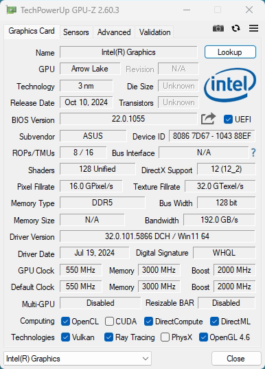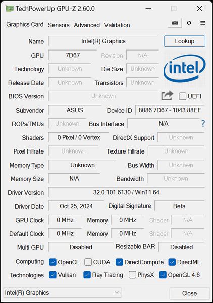 Вот так выглядит информационное окно утилиты GPU-Z — слева от публично доступной версии 2.60.0, а справа скриншот из обзора этого же процессора на собственном ресурсе производителей указанного ПО. Публично доступную версию пока что не научили понимать графическое ядро Intel и она выводит явно недостаточное количество информации.