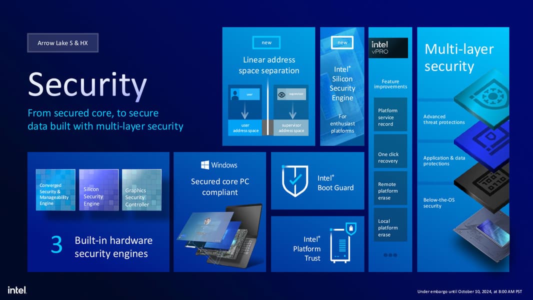Чипсет предлагает гигабитный сетевой адаптер и поддержку Wi-Fi 6, но возможности подключений по PCIe и USB открывают перед производителями системных плат множество вариантов — вроде поддержки Wi-Fi 7 и 2.5 гигабитной сети, и даже 5- и 10-гигабитной. Производители могут выбрать комплексное сетевое решение Intel Killer, сочетающее физический сетевой интерфейс Intel и систему приоритетов с технологией снижения задержек для сетевых игр. Также в Arrow Lake была обновлена подсистема защиты данных — три аппаратных движка для обеспечения безопасной работы с поддержкой концепции защищенного ядра Microsoft Edge Secured-core, если это кому-то интересно. Ну а мы переходим к самому главному — тестам.