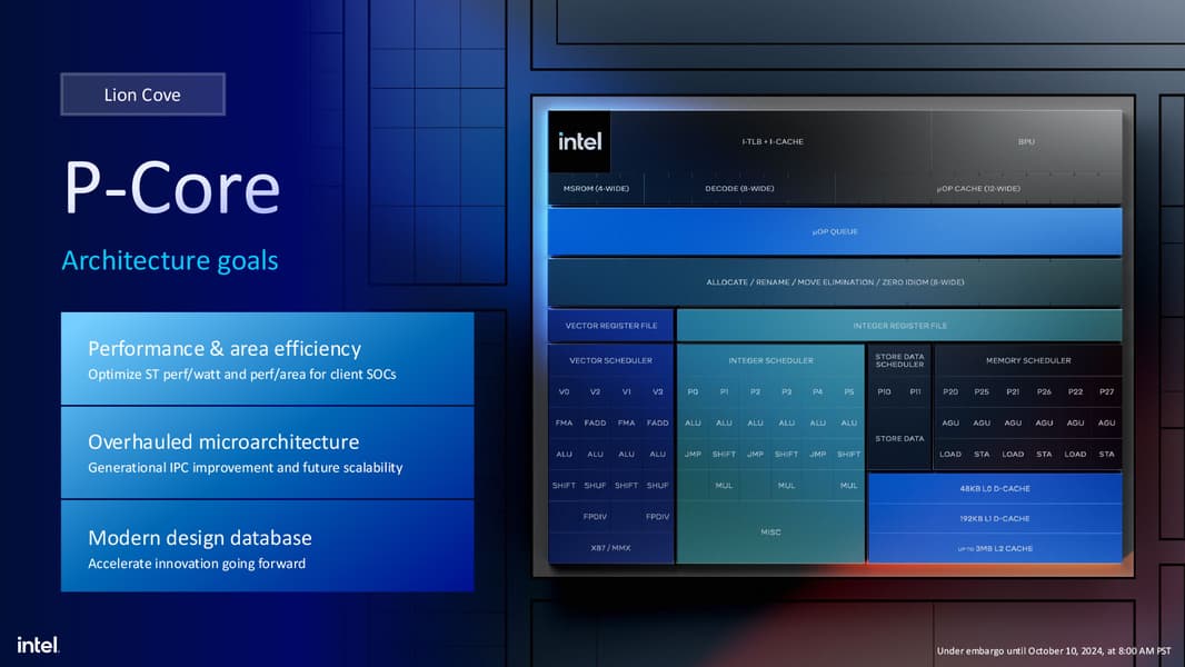 Intel убрала из вычислительных ядер Lion Cove компоненты, отвечающие за работу SMT, для того, чтобы уменьшить размер ядер на кристалле, а также потому, что повышение производительности на такт и энергоэффективности способно дать больше преимуществ. За счет упрощенных кристаллов и измененного лимита энергопотребления в Arrow Lake была перестроена микроархитектура — усовершенствованы все основные компоненты, включая конвейер и блок предсказания ветвлений, возможности которого были многократно увеличены. Была увеличена пропускная способность блоков выборки и декодирования, повышена емкость кэша микроопераций, целочисленный и векторный блоки движка внеочередного выполнения команд имеют раздельный доступ к очереди микроопераций — с независимыми планировщиками.