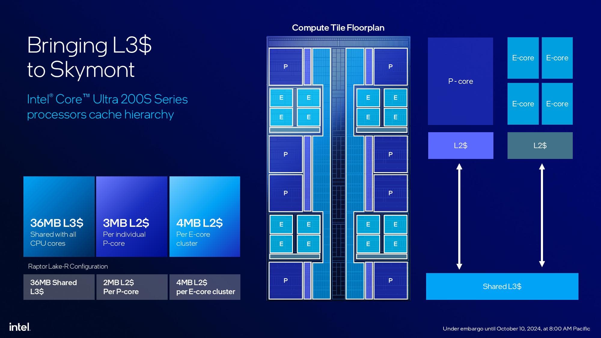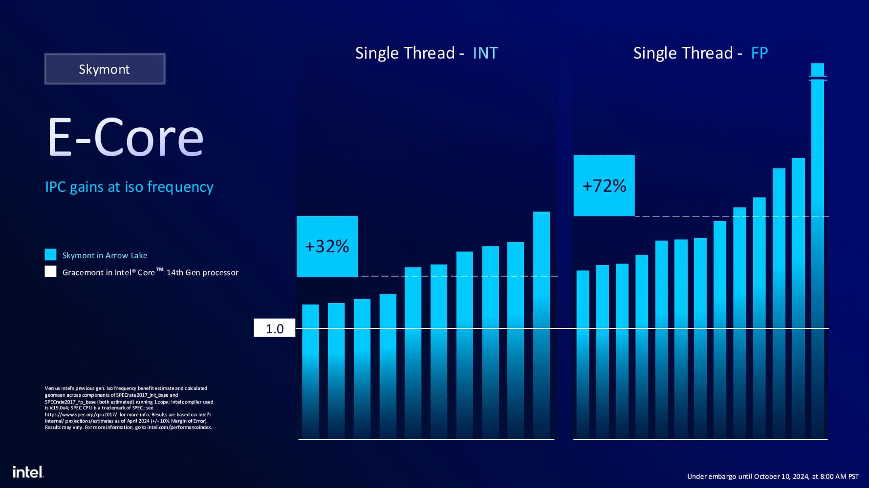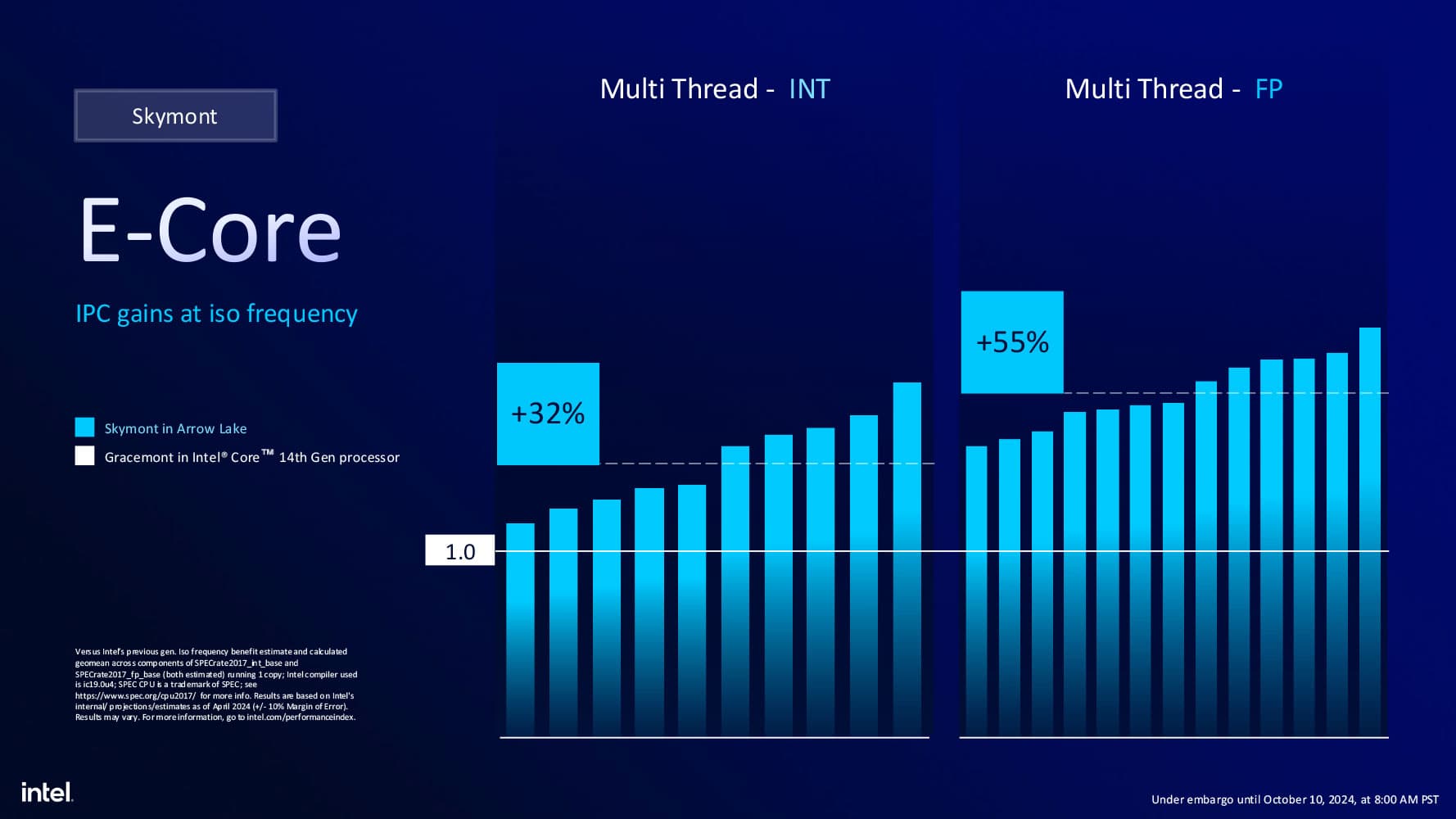 Эффективные E-ядра Skymont в Arrow Lake получили изменения, основные из которых сфокусированы на улучшении прогнозирования ветвлений и выборки инструкций, они имеют увеличенную пропускную способность для 128-битных типов данных с плавающей запятой, а также векторных типов, а L2-кэш получил удвоенную пропускную способность.