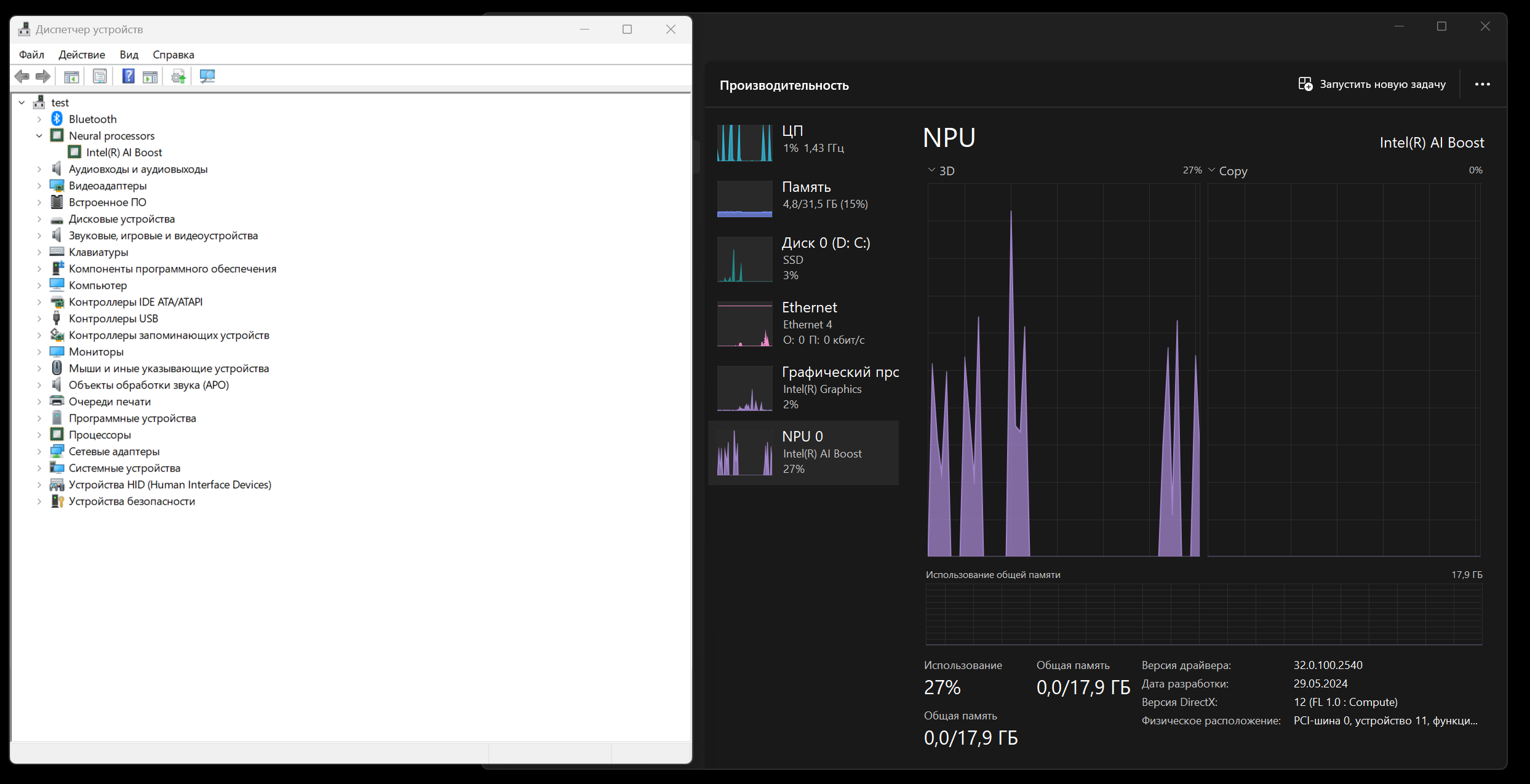 Из дополнительных фишек новых CPU семейства Arrow Lake отметим наличие в них нейропроцессора NPU, который ускоряет ИИ-операции локально. Это до сих пор используется нечасто, большинство таких приложений или являются облачными, или используют ресурсы CPU с GPU. Но NPU имеет свои плюсы и выглядит довольно перспективно, учитывая высокую энергоэффективность — в разы лучше, чем у универсальных вычислительных устройств, что подтвердили и наши тесты. Впрочем, в случае настольных ПК уровень вычислительной мощности CPU и GPU настолько велик, что NPU придется догонять их еще долго, так что сейчас наличие NPU не дает особых преимуществ. В будущем это может измениться.