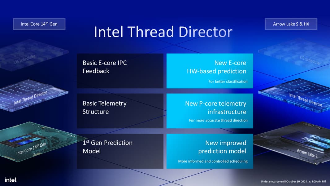 В серии Arrow Lake используется Thread Director уже третьего поколения — это аппаратный планировщик для распределения рабочих нагрузок по подходящим ядрам CPU. Новый планировщик более точно распределяет ресурсы ядер, в нем введен новый механизм телеметрии производительности P-ядер для более эффективного перевода нагрузок, применяется продвинутая модель предсказания нагрузок.