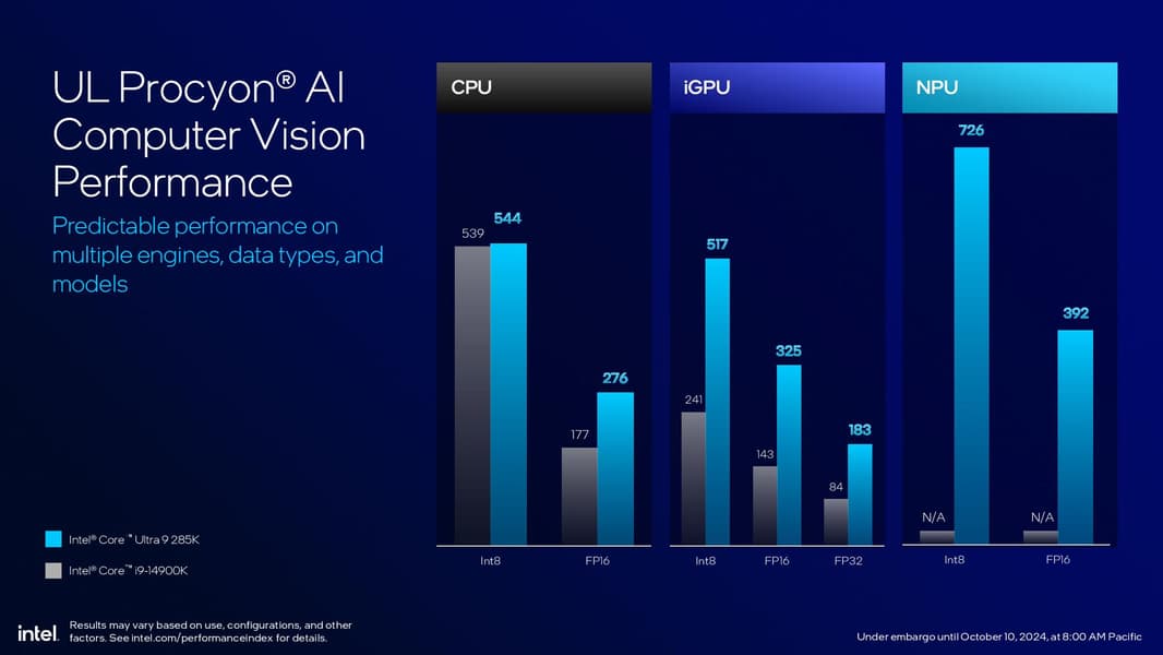 Кроме топовой модели Core Ultra 9 285K, у остальных представленных процессоров есть модификация и без интегрированного графического процессора: модели с индексом K имеют мощную интегрированную графику, а решения с индексом KF ее лишены. Встроенные GPU имеют по четыре укрупненных вычислительных блока во всех моделях CPU, а небольшое отличие по их рабочей частоте в 100 МГц можно считать несущественным. Также во всех моделях есть нейропроцессор NPU с одинаковыми параметрами вычислительной производительности.