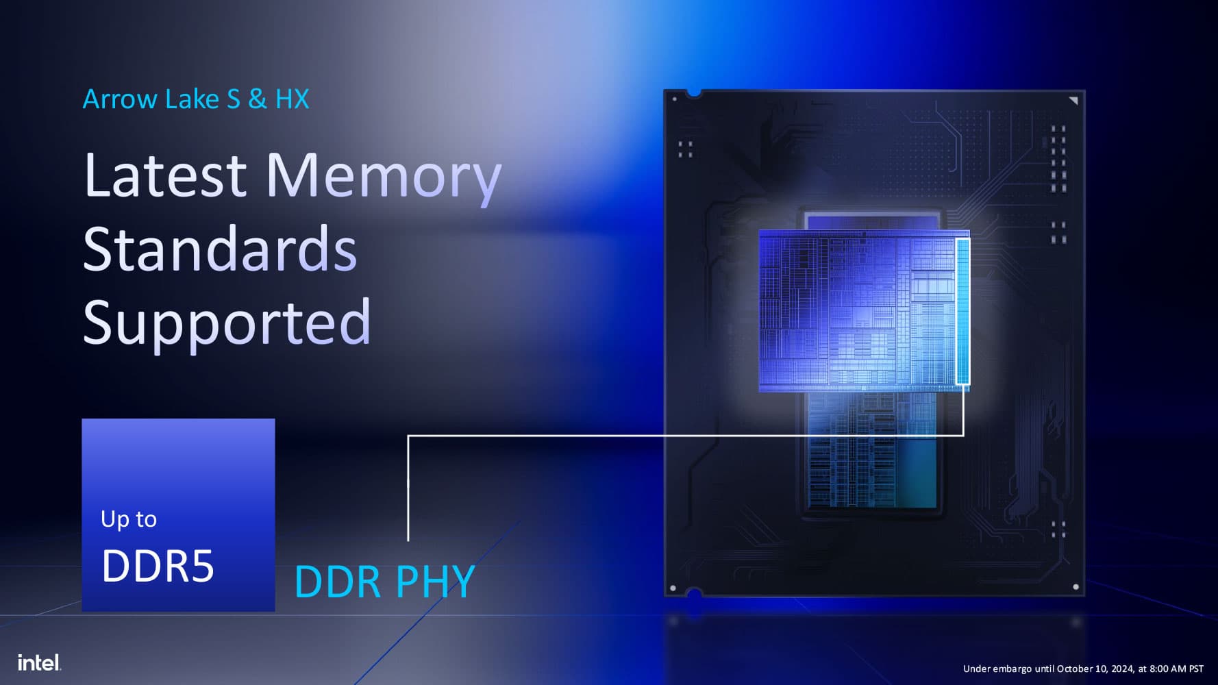Настольные процессоры Arrow Lake-S поддерживают установку памяти модулями до 48 ГБ и до 192 ГБ памяти в двухканальном режиме. Поддерживается стандарт JEDEC DDR5-6400 и более производительные модули, но «золотой серединой» сама Intel считает скорость DDR5-8000. Новые процессоры с прицелом на будущее поддерживают память, разогнанную вплоть до скоростей DDR5-9600, а в будущем и больше 10000 МТ/с — всё благодаря внедрению модулей памяти CUDIMM (Clocked Unbuffered Dual In-line Memory Module) со встроенными тактовыми генераторами.