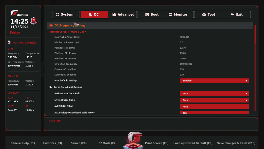 Разблокированный множитель дает простые возможности для разгона процессора Intel Core Ultra 9 285K. Тем более, что довести процессор до температурного лимита в 105 °C, после чего начинается тротлинг, в случае нового CPU стало куда сложнее, чем разогреть тот же i9-14900K до 100 °C — последнее достигается почти в любой требовательной задаче. Да, Intel повысила максимальную температуру по умолчанию до 105 °C — по сравнению со 100 °C для предыдущего поколения и 95 °C для процессоров AMD. А вручную можно изменить предел аж до 115 °C.