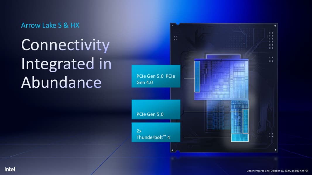 Процессоры Arrow Lake-S предлагают двухканальный интерфейс памяти DDR5, а платформа целиком (процессор с чипсетом) дает 48 линий PCIe. От CPU идет 20 линий PCIe Gen 5 — 16 линий для слота x16 под видеокарты и один подключенный к CPU слот NVMe, который может работать на скорости 5.0, не отбирая линии графического разъема. Также от процессора идет второй набор из четырех линий — уже Gen 4, его можно использовать для NVMe или другого скоростного устройства, вроде контроллера Thunderbolt 5. Сам же CPU предлагает встроенный контроллер Thunderbolt 4 — на два порта скоростью 40 Гбит/с.