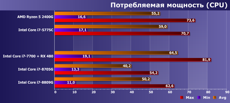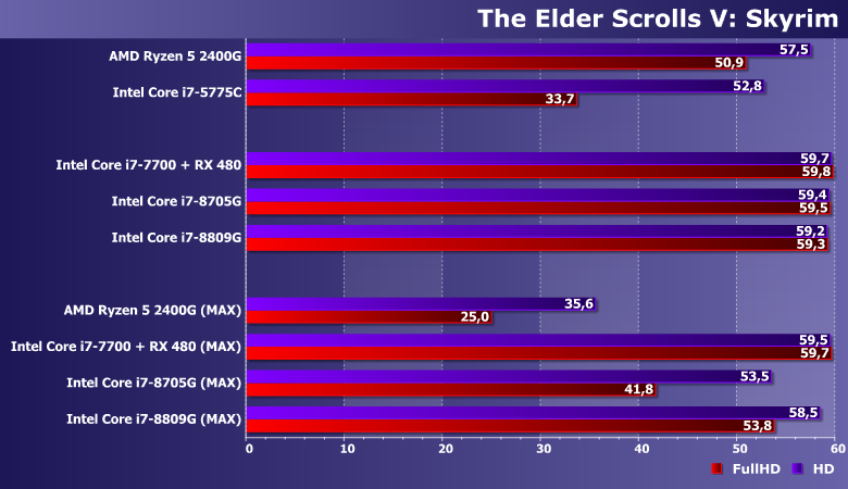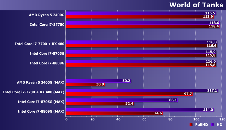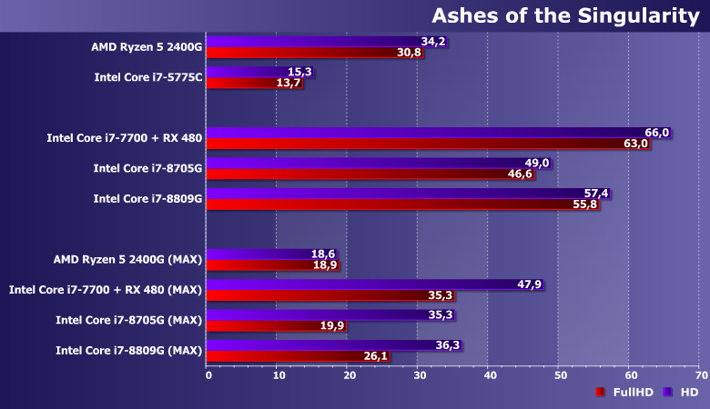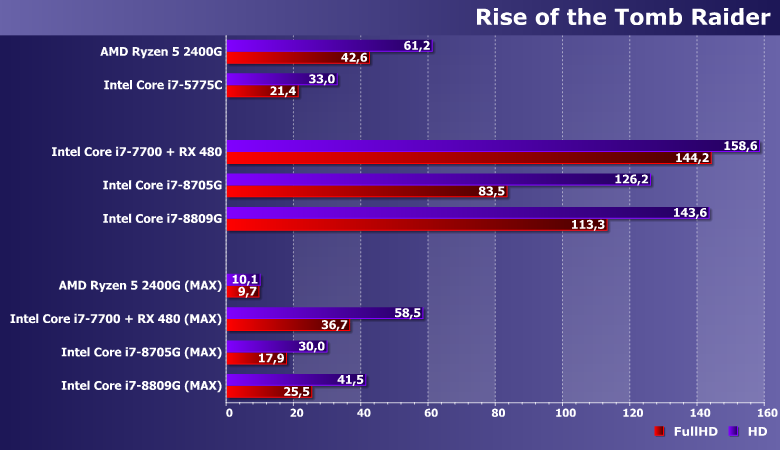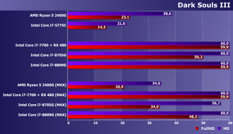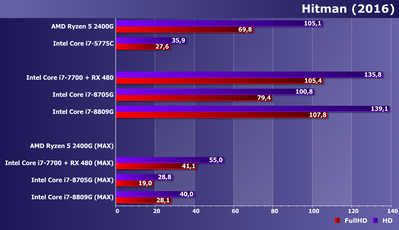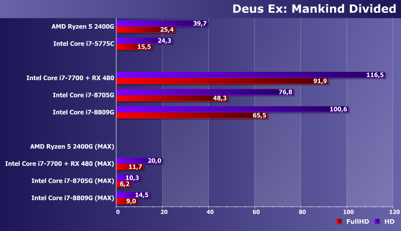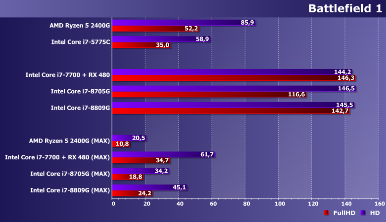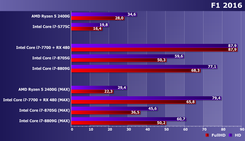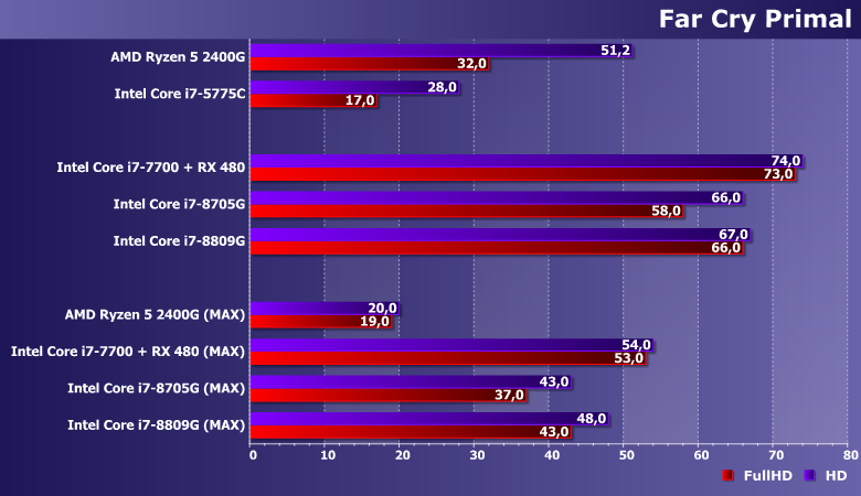 Основным же преимуществом 8809G над 8705G является более мощный GPU. Впрочем, с минимальными-то настройками в этой игре справляются все и с запасом. Однако на максимальные запаса уже не хватает — даже на RX 480 частота кадров в Full HD снижается. Ryzen 5 2400G же в таком случае и вовсе «сдувается» до 30 FPS — а ведь это лучшее интегрированное видео на рынке! Если рассматривать «интегрированное» в традиционном понимание, поскольку в сборке Kaby Lake-G оно тоже не совсем дискретное, как уже было сказано выше :) Но способное обеспечивать комфортную игру и на максимальных настройках, причем и в высоком разрешении тоже — во всяком случае, Vega M GH это может.