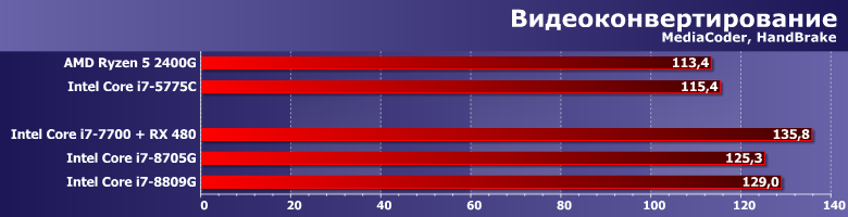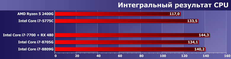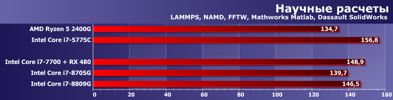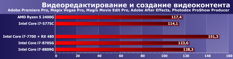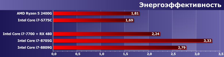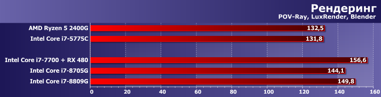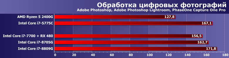 В итоге повторно тестировать Ryzen 5 2400G и Core i7-5775C в обновленном окружении мы не стали — данные по производительности взяли из «основной линейки» тестов, а за энергопотребление приняли то, что поступает по линии +12 В. Для LGA1150 и LGA1151 эти данные точно совпадают с показателями мониторинга, так что мы продолжаем исходить из предположения, что и для АМ4 такие измерения верны — проверить их сейчас все равно пока нечем из-за описанной ситуации с датчиками. Влиянием SSD решено было пренебречь, поскольку Core i7-7700 мы совместно с Intel 760p на 512 ГБ как раз и протестировали — после чего убедились, что как он, так и Radeon RX 480 на результатах сравнительно с «просто» процессорной графикой и обычно используемым Corsair Force LE 960 ГБ не сказываются: расхождение в пределах 5%. Но на диаграммах мы на всякий случай Ryzen 5 2400G и Core i7-5775C «нарисуем» немножко в сторонке от прочих участников тестирования.