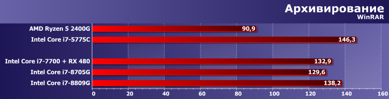 А архиваторы сразу показывают разницу между ускорением доступа к памяти при помощи дополнительных уровней кэширования и... просто выделенной областью для GPU: кэш четвертого уровня в Broadwell могут использовать и процессорные ядра. С пользой для себя :) Так что хотелось бы увидеть и развитие этого подхода. Впрочем, тут топовый Kaby Lake-G все равно сумел немного опередить своего настольного собрата, но не на много — вполне возможно, что из самих модулей памяти (разных по понятным причинам — в NUC устанавливаются SO-DIMM) удалось выжать немного меньшие задержки.