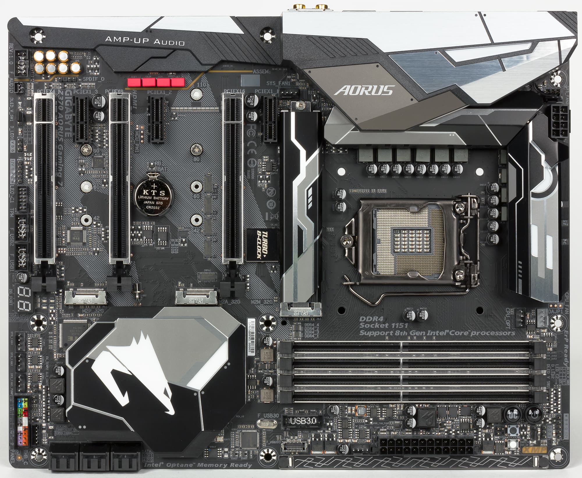 В топовых моделях набор портов, разъемов и слотов может быть побогаче. В качестве примера такой топовой конфигурации можно привести плату Z370 Aorus Gaming 7 от компании Gigabyte. На ней на базе чипсета реализовано три разъема M.2, два гигабитных сетевых разъема, слот PCI Express 3.0 x4 и три слота PCI Express 3.0 x1, шесть портов SATA, три порта USB 3.1 и семь портов USB 3.0. Естественно, есть и два слота PCI Express 3.0 x16/x8, реализованных на базе процессорных линий PCIe 3.0.