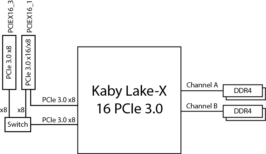 В варианте процессора с 16 линиями PCIe 3.0 (Kaby Lake-X) просто блокируется еще один слот PCI Express 3.0 x16 и остаются только слоты PCI Express 3.0 x8 и PCI Express 3.0 x4.