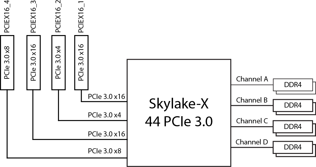 В простом случае (не очень дорогие платы) реализация следующая. В варианте процессора с 44 линиями PCIe 3.0 будет доступно два слота PCI Express 3.0 x16, один PCI Express 3.0 x8 (в форм-факторе PCI Express x16) и один PCI Express 3.0 x4 (опять же, может быть в форм-факторе PCI Express x16).