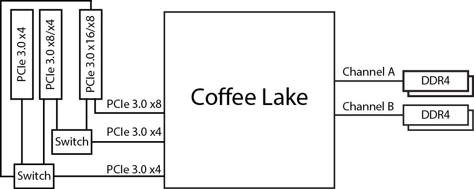 Во всех остальных вариантах (чипсеты H370, B360 и H310) может быть только один слот PCI Express 3.0 x16 на базе 16 процессорных линий PCIe 3.0.