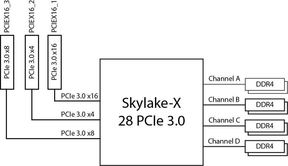 В варианте процессора с 28 линиями PCIe 3.0 один слот PCI Express 3.0 x16 станет недоступен, то есть будет только один слот PCI Express 3.0 x16, один PCI Express 3.0 x8 и один PCI Express 3.0 x4.