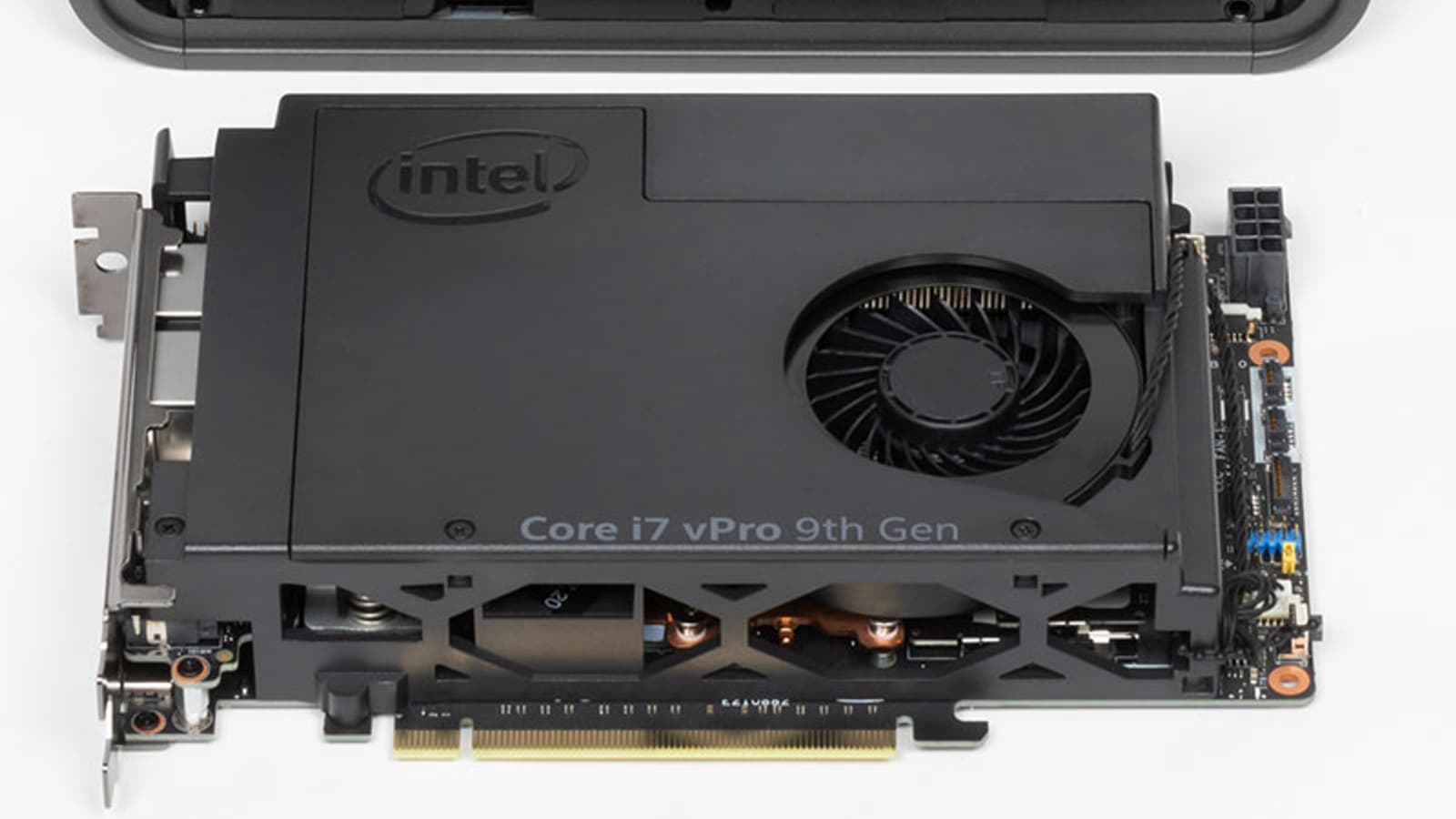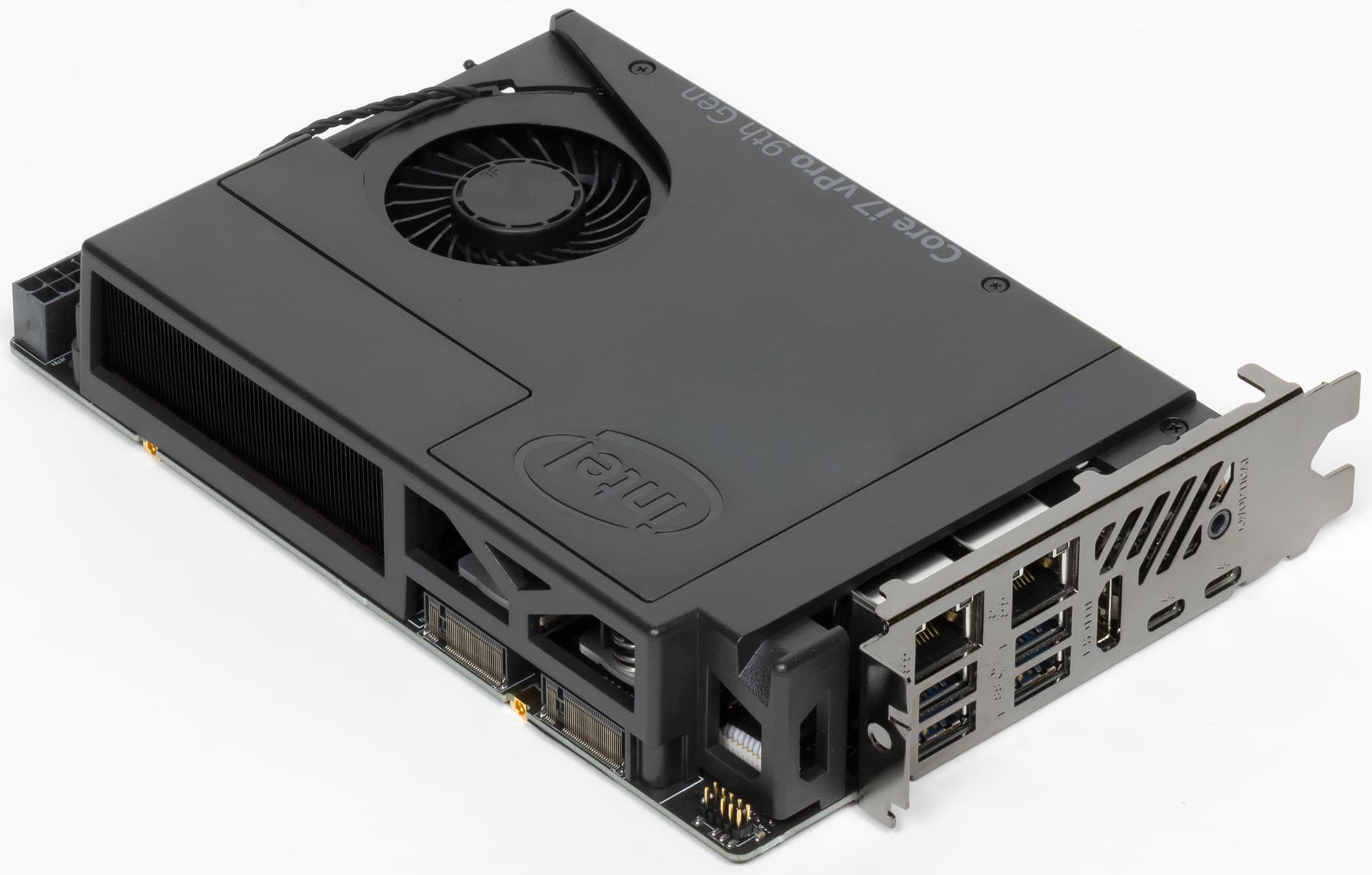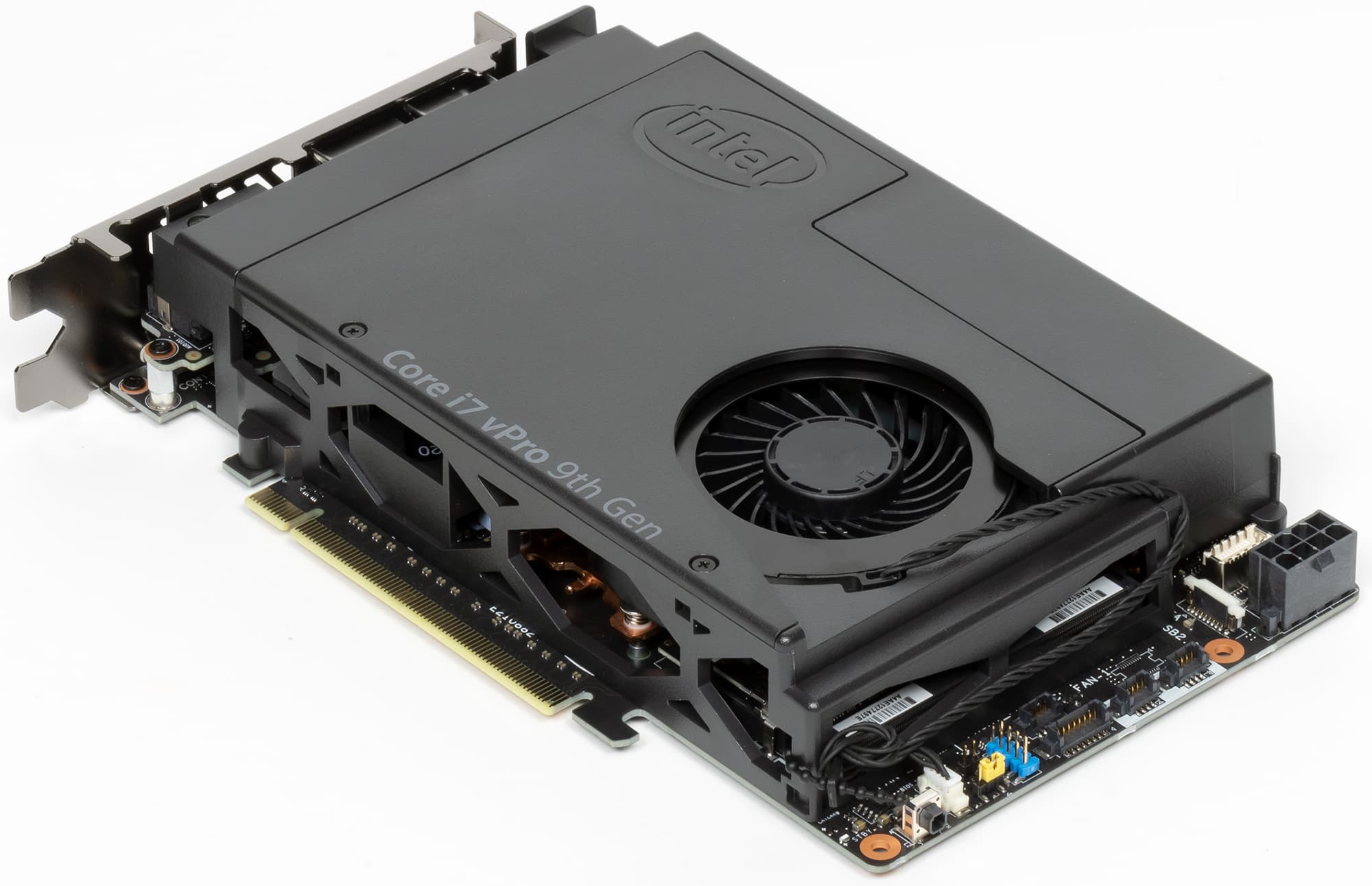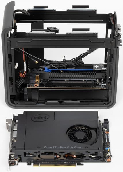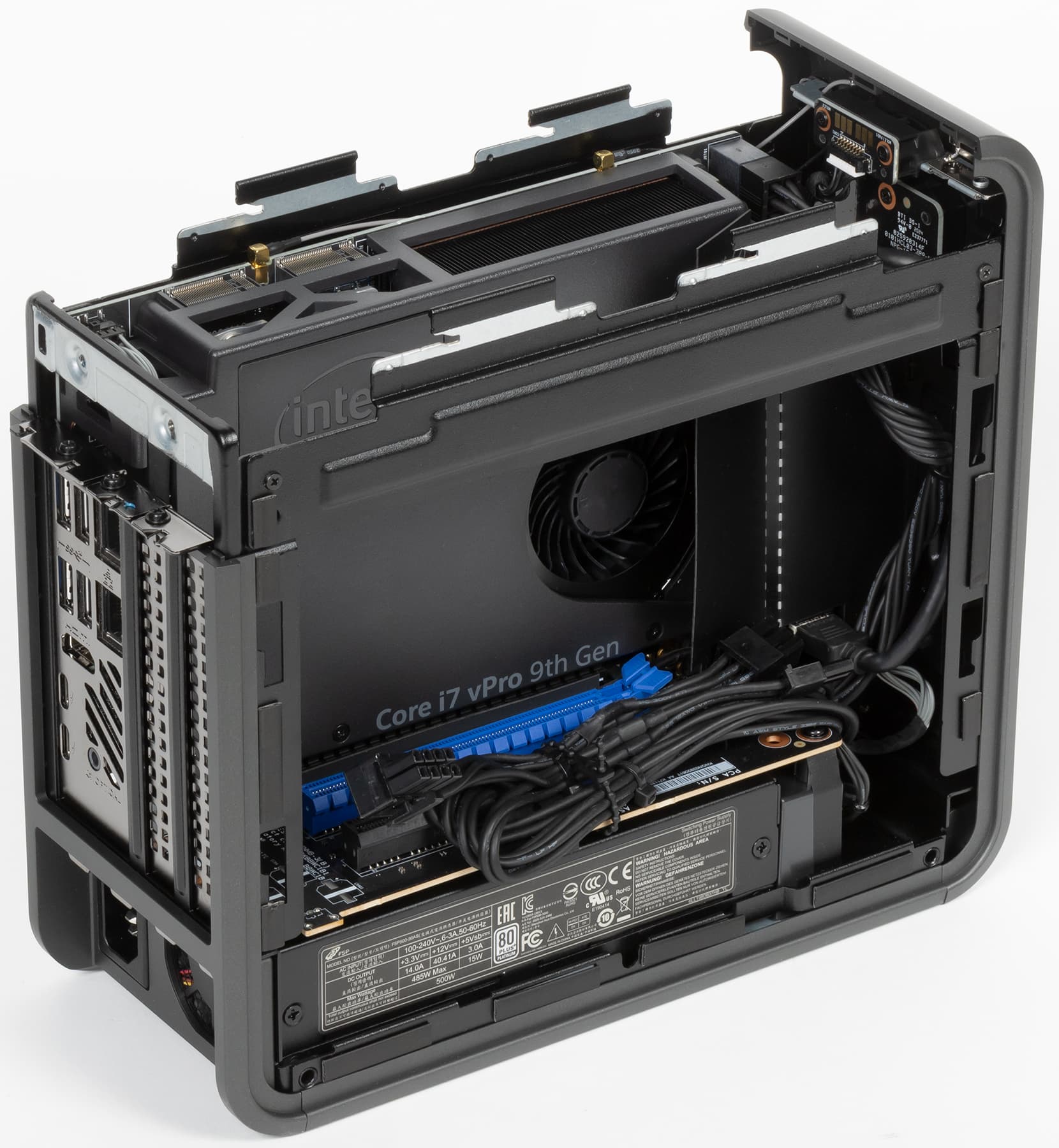Также в прошлом обзоре было вскользь затронуто немного другое направление: мы упомянули, что, кроме трех моделей NUC 9 Extreme, в ассортименте Intel есть и два NUC 9 Pro — в первом приближении идентичные Extreme, но ориентированные на корпоративное использование. Дело в том, что в условных офисах (вопреки расхожему мнению) потребности пользователей очень часто далеко выходят за список ворд-эксель-браузер, так что наиболее компактных мини-ПК иногда оказывается маловато. Проблема процессорной производительности может быть решена компактными моделями на базе низкопотребляющих «сокетных» процессоров, зачастую тоже укладывающимися в литровый объем и производимыми всеми крупными компаниями. Некоторое количество таких моделей мы уже тестировали, но всех их объединяет одно: процессоры-то менять можно, а вот видео — только интегрированное. А этого для некоторых видов деятельности тоже становится недостаточно — даже специальной «профессиональной» серии UHD Graphics P630 (используется в процессорах Xeon), благодаря оптимизированным драйверам до сих пор способной «накрутить хвост» многим игровым видеокартам в пакетах 3D-моделирования и пр. Но даже младшие Quadro — все-таки уже лучше. При этом они компактнее игровых решений и не слишком страдают от PCIe 3.0 x8, а в этом случае штатное шасси NUC позволяет использовать еще одну карту расширения и хватает линий на третий слот M.2. Возможность установки трех-четырех накопителей, кстати, тоже большая редкость для компактных систем. Правда, нам попадался тот же Lenovo ThinkStation P330 SFF, где и процессор «сокетный», и DVD-привод компания в конфигурацию «впихнула», и установить можно не только второй SSD, но и недорогой жесткий диск, и три слота расширения есть (хотя в них помещаются исключительно низкопрофильные карты длиной до 15 см). Однако общий объем такого корпуса превышает 9 литров, т. е. примерно вдвое больше, чем у NUC 9 Extreme/Pro. При этом все SSD у NUC 9 Extreme/Pro «скоростные», видеокарту можно установить более габаритную, да и с периферийными разъемами дело обстоит лучше. А цены… цены могут оказаться сопоставимыми.