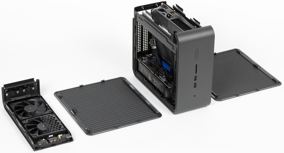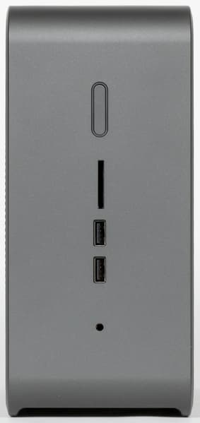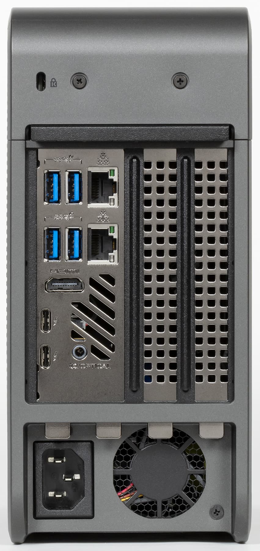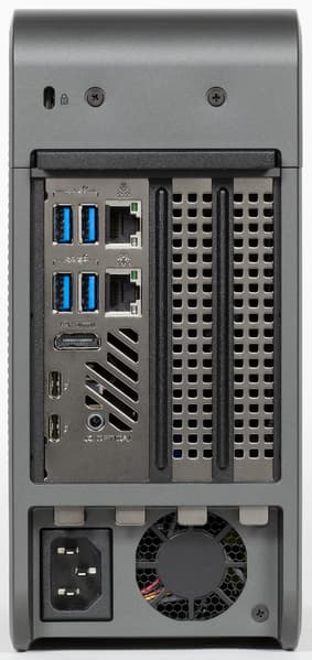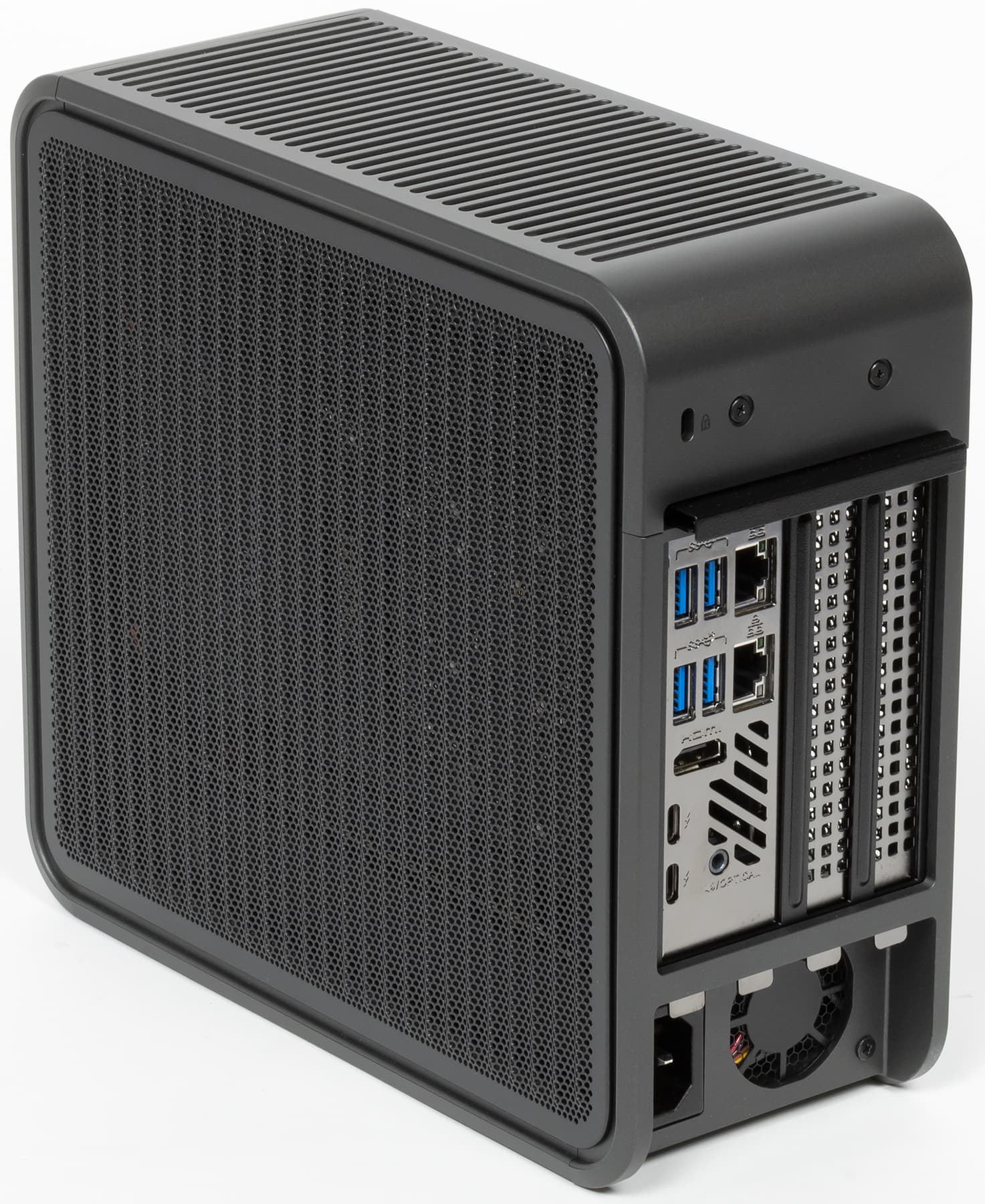 Все интерфейсные разъемы — как и ранее, спереди и сзади. Причем разъемы те же самые. На передней панели: два порта USB3 Gen2, кнопка включения и разъем для подключения гарнитуры. Также сюда переехал полноразмерный слот для SD-карт с поддержкой UHS-II, т. е. скоростных режимов до 312 МБ/с. Сзади отметим наличие четырех портов USB3 Gen1, двух — Thunderbolt 3 (могут использоваться и как USB, что доводит общее количество USB-портов до восьми), и целых двух гигабитных сетевых разъемов. Кроме того, для вывода видеосигнала со встроенного GPU предназначен HDMI 2.0a. Все эти разъемы расположены на «процессорной» карте. Рядом с ней могут «появиться» и новые — при установке карт расширения. И не только видеокарты: например, сеть на 10 Гбит/с или контроллер USB3 Gen2×2, или и то, и другое сразу. Главное помнить, что карт расширения может быть две, высота — практически не ограничена (т. е. низкопрофильные не требуются), а длина их не должна превышать 203 мм.