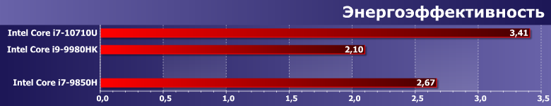 Соответственно, и энергоэффективность именно шестиядерных Core i7 в NUC 9 максимальная. Более компактные модели по этому параметру, разумеется, лучше, но достигается это за счет сниженной абсолютной производительности.