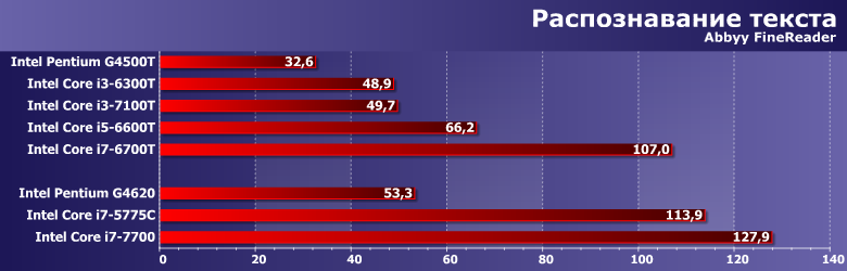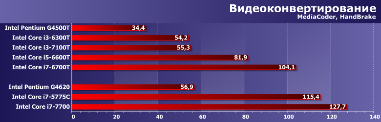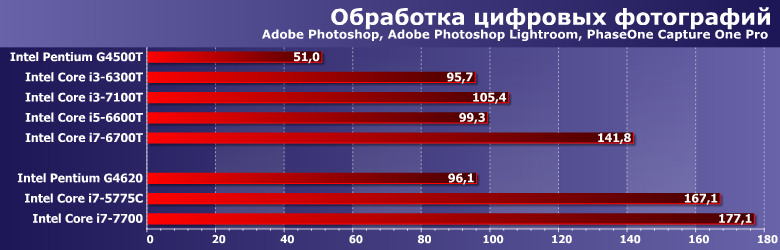 Как обычно «порезвился» Photoshop (точнее один из используемых нами до последнего времени фильтров), хотя это не так и важно — как видим, всем программам вообще важна однопоточная производительность и, желательно, стабильная. Поэтому и старательно сбрасывающий частоту при первой возможности i7-6700T тоже не блещет. Зато поразили оба Core i3, практически не уступающие или вообще превосходящие Pentium G4620, несмотря на заметно более высокую тактовую частоту последнего.