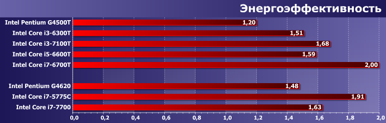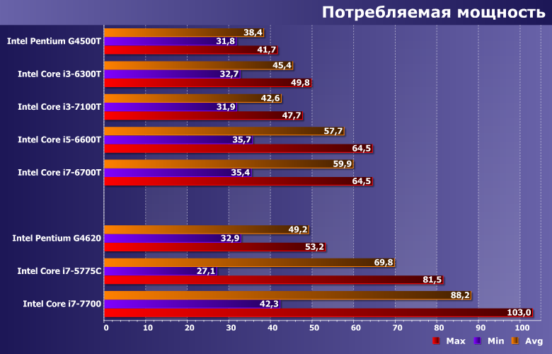 В принципе, если говорить о чистой производительности, то с ней было сразу все ясно — с регулярными моделями можно было даже не сравнивать. Хотя… По большому счету i7-6700T отстает от i7-7700 на каких-то 20%. Многие некогда топовые процессоры он и вовсе обгоняет — не только FX-8350/8370, но и любые Core i7 для LGA1155, например. Они, конечно, появились на четыре с лишним года ранее, так что на революцию это не тянет. Но мы как раз только добрались к главной особенности процессоров этой линейки.