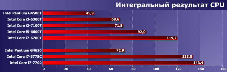 Чудес на свете не бывает, так что G4500T с треском проиграл всем. Core i3 работают чуть хуже современного Pentium — тоже плата за суффикс «Т», поскольку без него, все-таки, как мы уже выяснили, даже старенький i3-6100 все равно быстрее G4620. Да и Core i7-6700T самый медленный из всех трех Core i7. Впрочем, его результаты выше, чем у референсного AMD FX-8350, который и сам по себе требует на сотню Ватт больше, и еще без видеокарты не обходится.