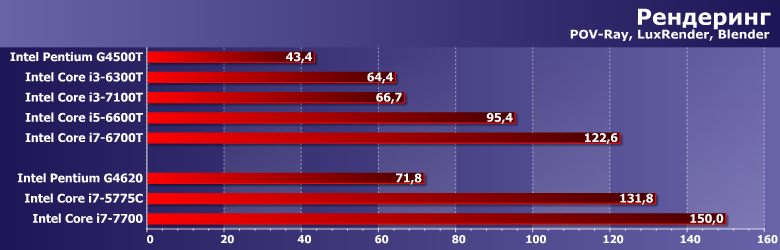 А вот при не совсем равных возможны варианты. В частности, в этой группе SkyLake/Kaby Lake заметно быстрее предшественников и при сопоставимых частотах, так что i7-6700T оказался в общем зачете вторым, а не третьим.