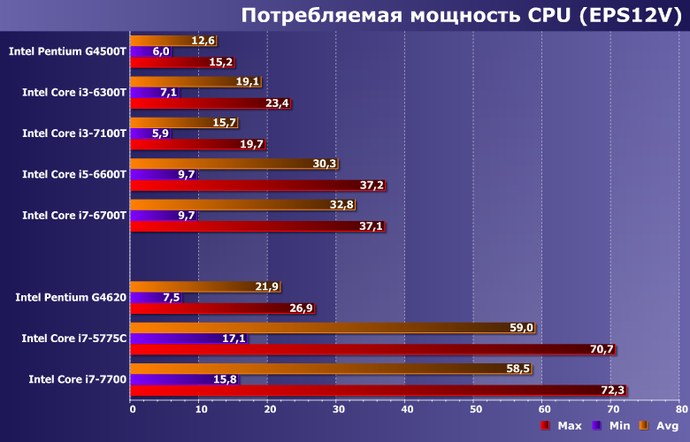 Большинство испытуемых «трудились» на одной и той же системной плате, которая сама по себе (как выяснилось) высокой экономичностью не отличается. Для процессоров регулярных линеек это особого значения не имеет, а вот в данном случае каждый ватт на счету, поэтому лучше посмотрим на потребление энергии непосредственно процессорами (на платформах LGA1150 и LGA1151 они целиком и полностью ограничиваются «своей» линией питания 12 В).
