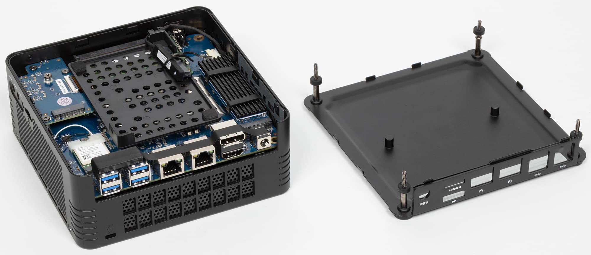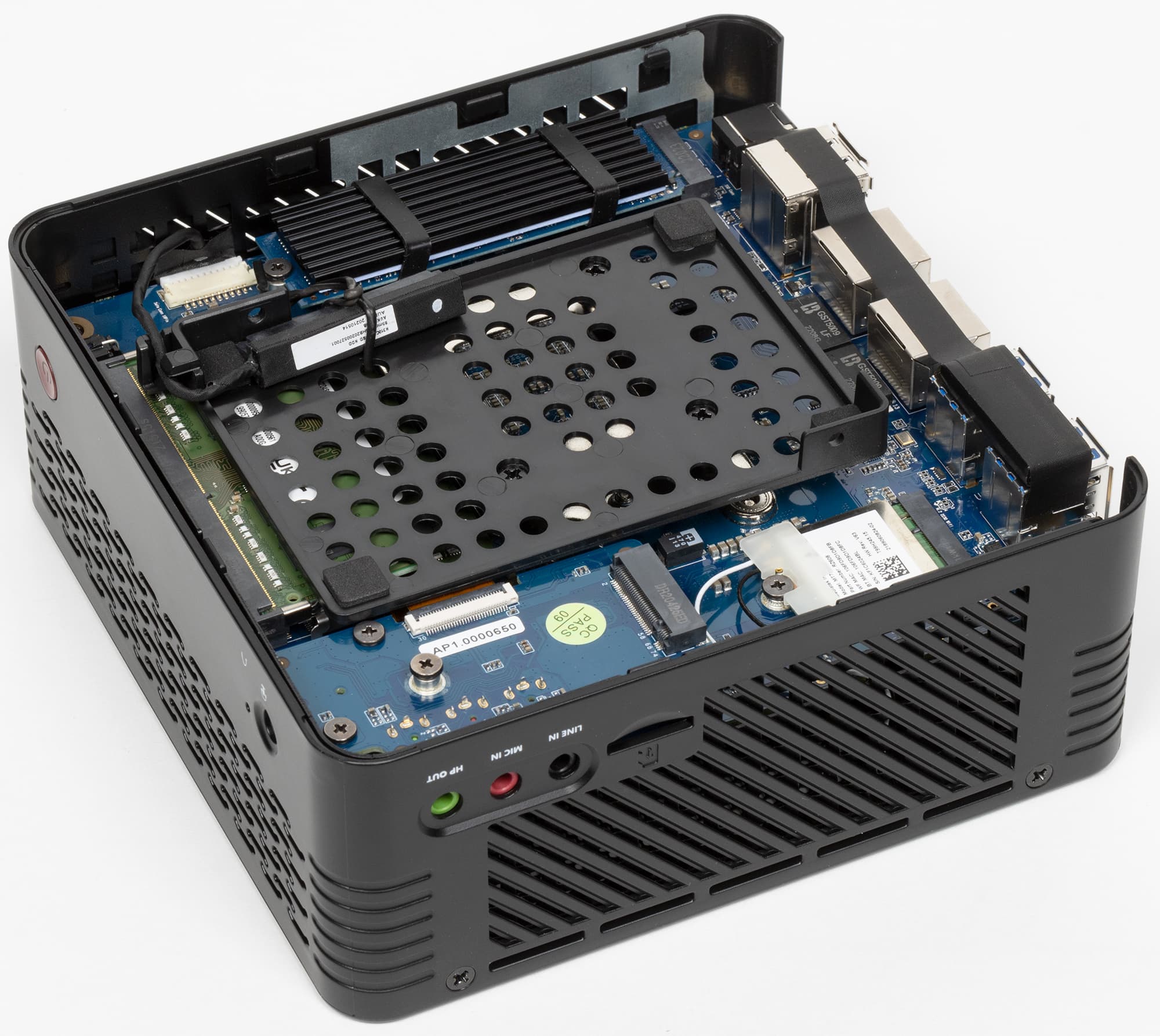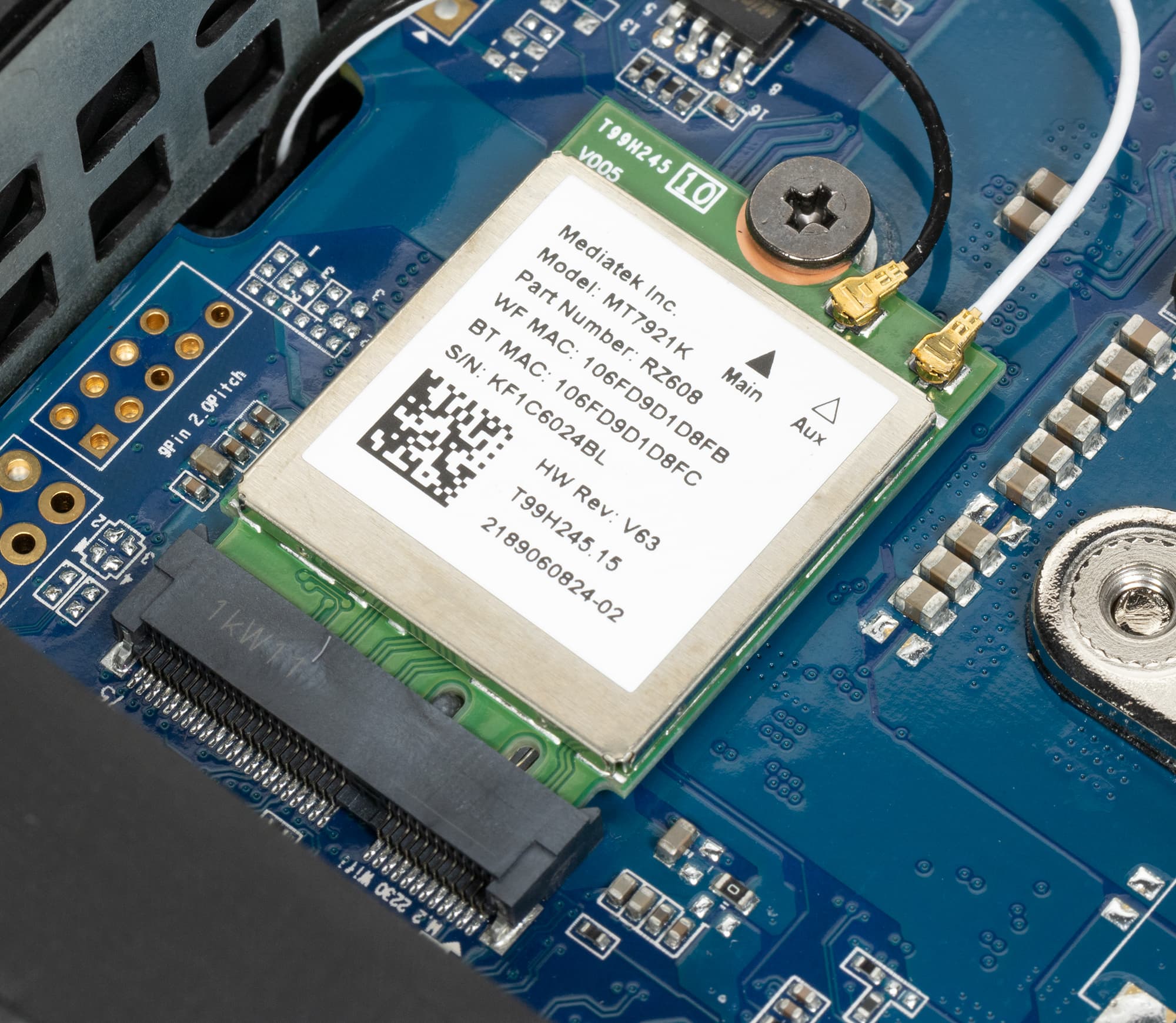 Про беспроводной адаптер можно сказать то же самое: несмотря на возможность легкой замены, это вряд ли в обозримой перспективе потребуется на практике, поскольку MediaTek MT7921K поддерживает Wi-Fi 6E на скоростях до 1,8 Гбит/с и Bluetooth 5.2. Единственное, что может смутить — Mediatek, а не более привычный Intel. Но этот вопрос был бы актуален, продавай компания платформу для (до)сборки, а не законченное решение, упакованное практически по максимуму. Сразу установлен топовый процессор, достаточное количество памяти, емкий и в меру быстрый SSD — и беспроводной адаптер тоже в комплекте. То есть получился прямой конкурент законченным мини-ПК — в том числе и на ноутбучных платформах. Менять-то в Irbis IMFPC107 можно всё — но незачем. Разве что проводную сеть «проапгрейдить» кому-то было бы интересно, но это как раз невозможно.