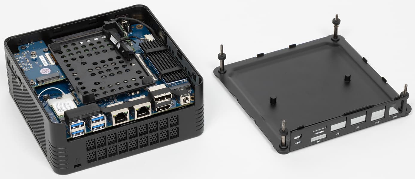 Irbis IMFPC107 похож на NUC не только внешне, но и внутренне. Фактически системная плата здесь разбивает внутренний объем на два отсека — побольше и поменьше. В первом находится самый горячий элемент — процессор. Во втором — все остальные. Такая концепция родилась 10 лет назад вместе с первыми NUC и долгое время вопросов не вызывала. Однако есть к ней и претензии: этот самый второй отсек никак не продувается, а в нем могут размещаться довольно прожорливые компоненты, типа современных SSD. Да и вообще такая многоэтажная скученность немного пугает. Но на деле всё работает.