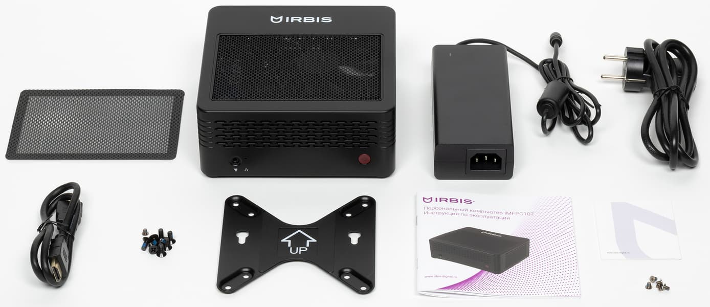 Зато это один из самых маленьких компьютеров на настольном Ryzen 7. И, как и любой другой мини-ПК, его можно просто повесить сзади монитора или телевизора — для чего в комплекте поставки есть всё необходимое. Также нельзя не отметить наличие дополнительного съемного пылевого фильтра, что может пригодиться в запыленных помещениях. Хотя на совсем уж неблагоприятные условия эксплуатации Irbis IMFPC107 не рассчитан — для них лучше подобрать что-нибудь пусть более медленное, но в глухом корпусе с пассивной системой охлаждения. А компьютер Irbis — просто сильно уменьшенный десктоп.